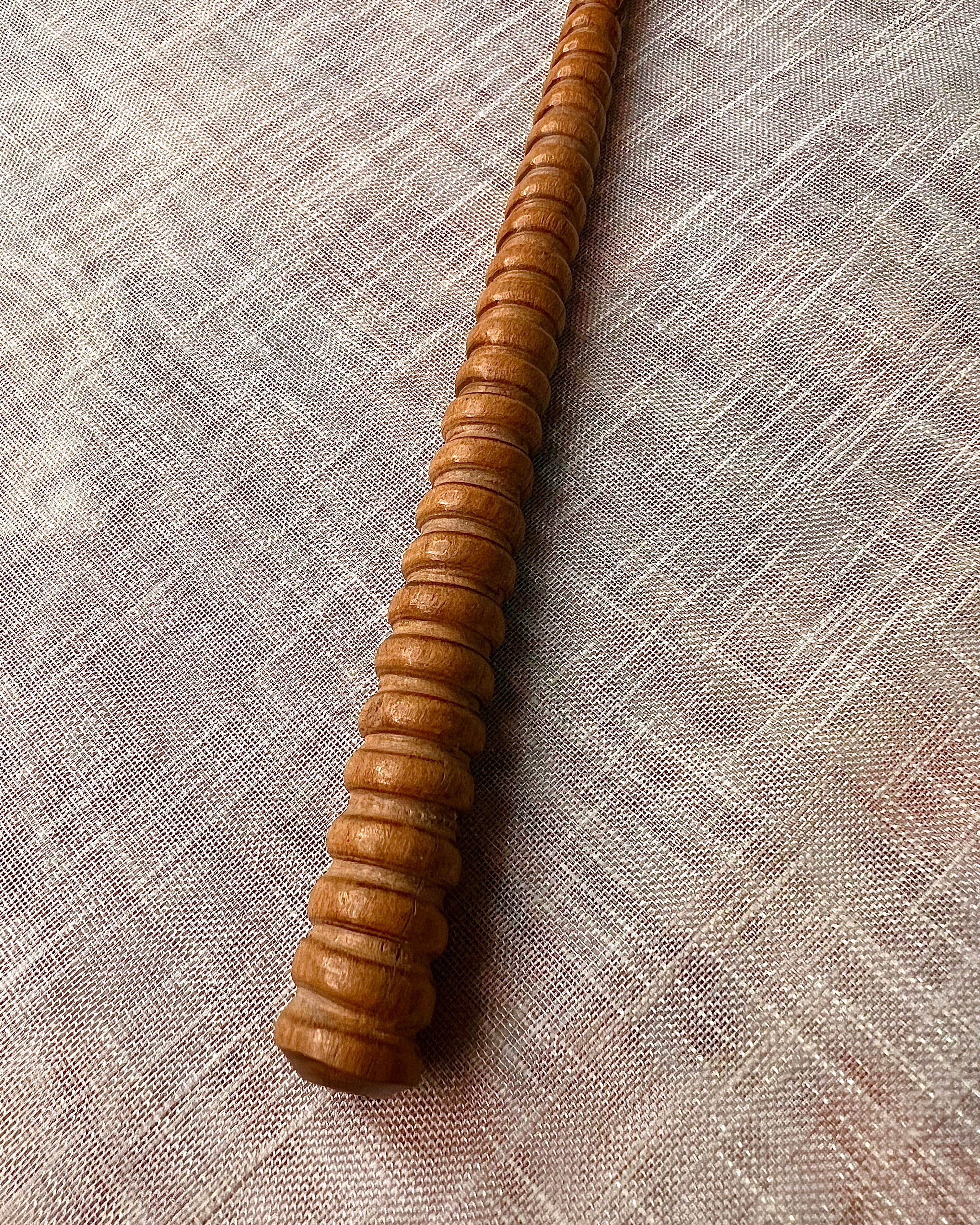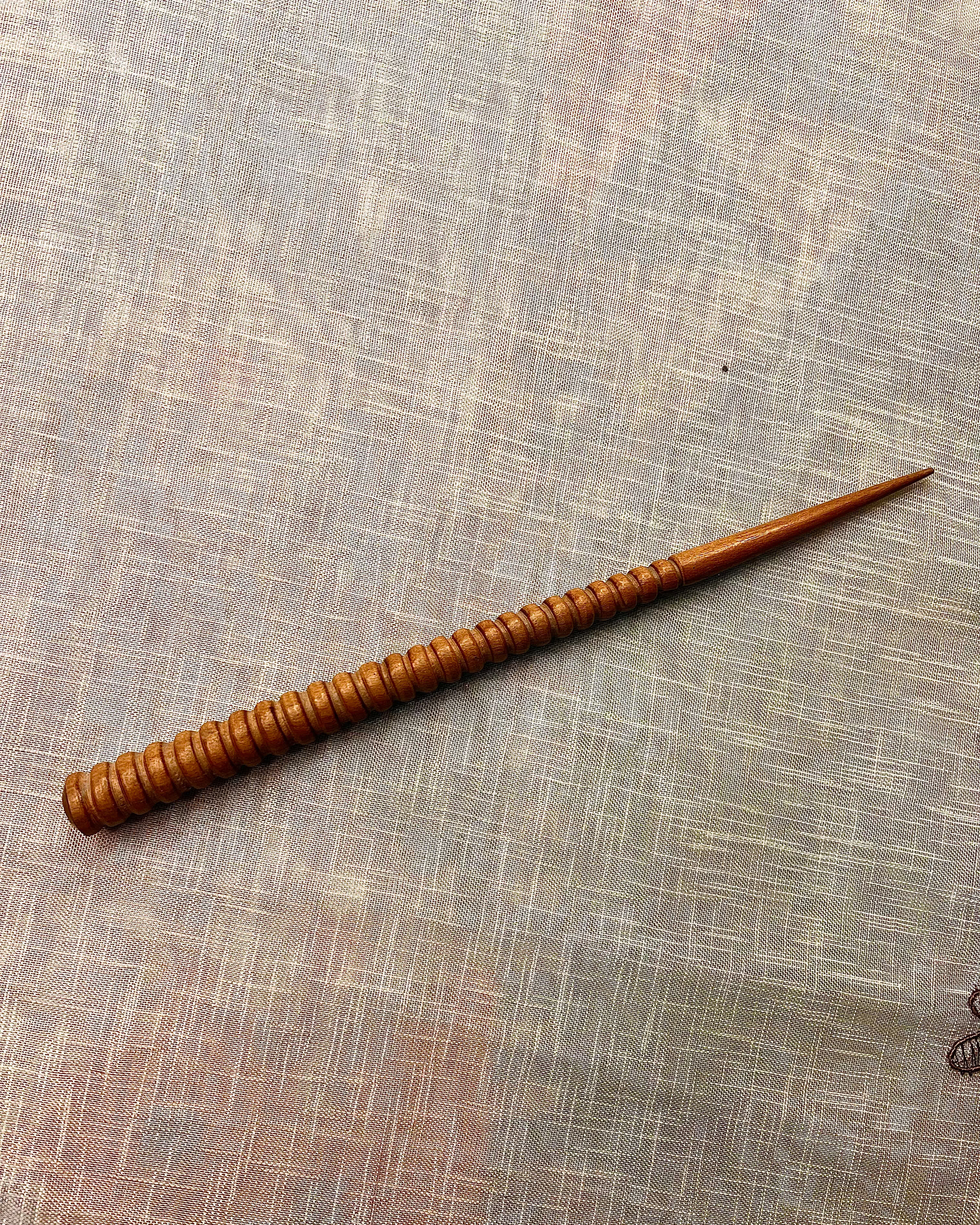 A handcrafted wooden hair stick with a ribbed grip, designed for effortless everyday styling with a grounded, earthy feel.