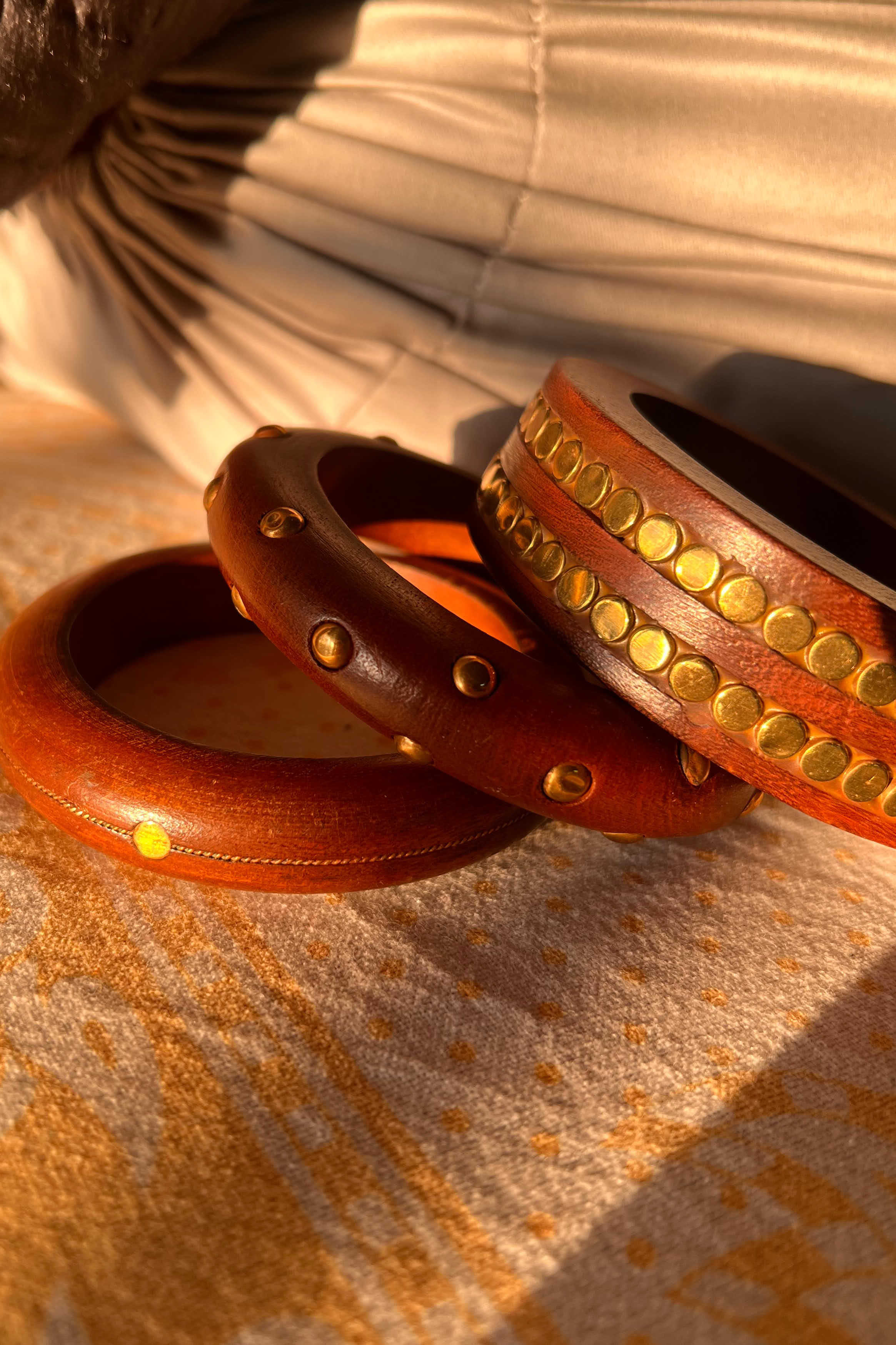 A set of handcrafted wooden bangles detailed with brass accents, blending warm natural tones with subtle metallic character.