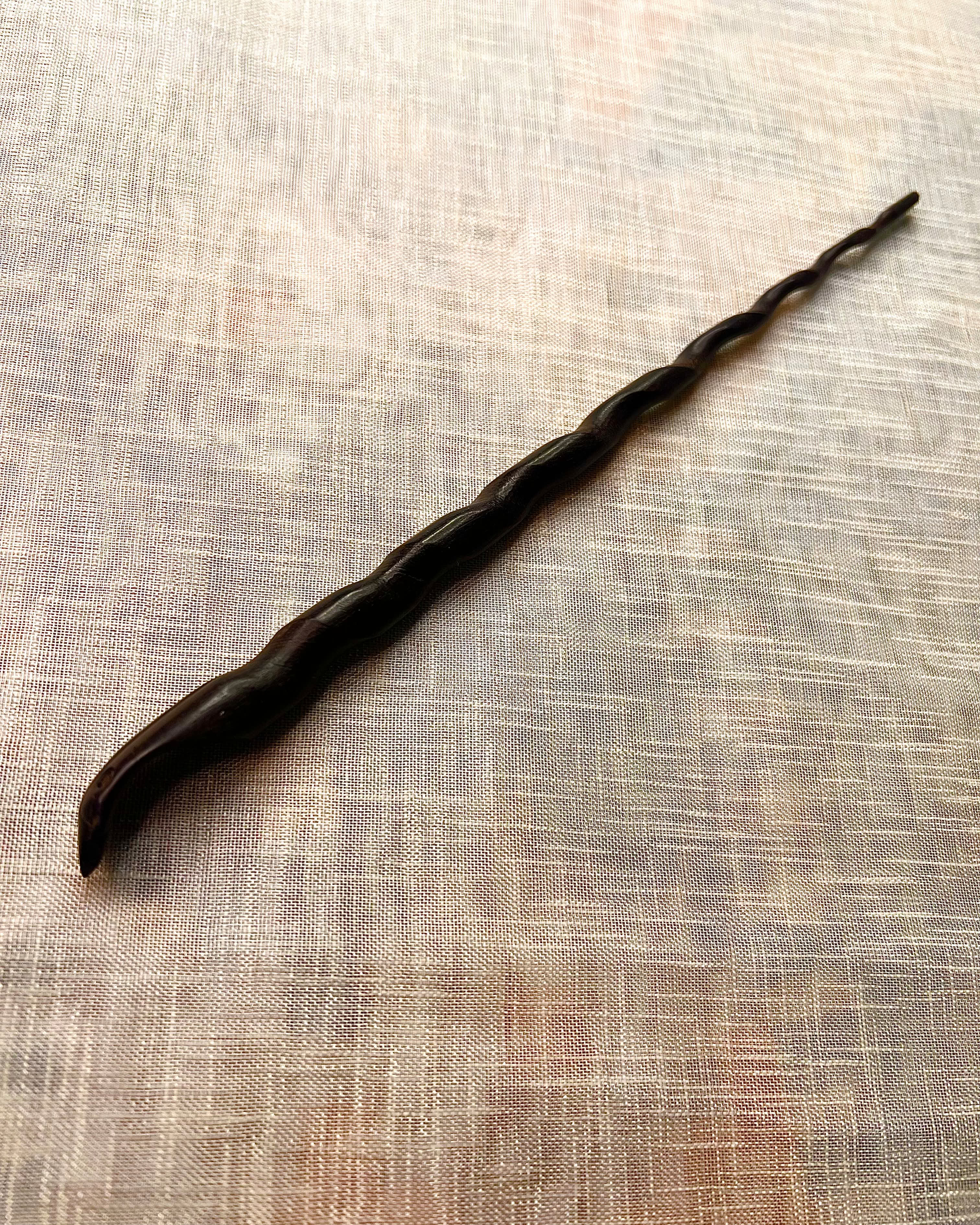A minimalist, hand-carved wooden hair stick with a natural spiral form, designed to secure buns effortlessly while adding an earthy, timeless touch.
