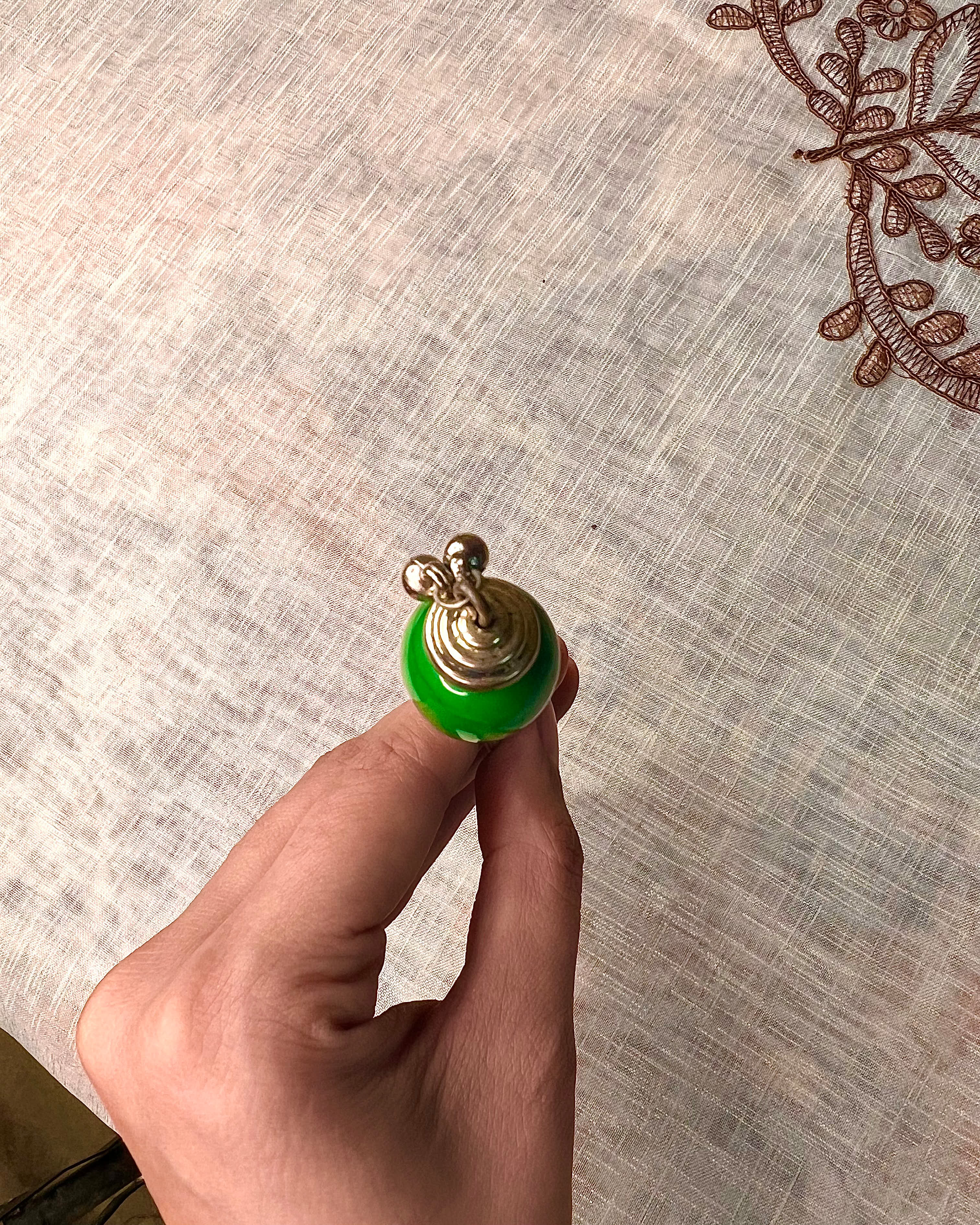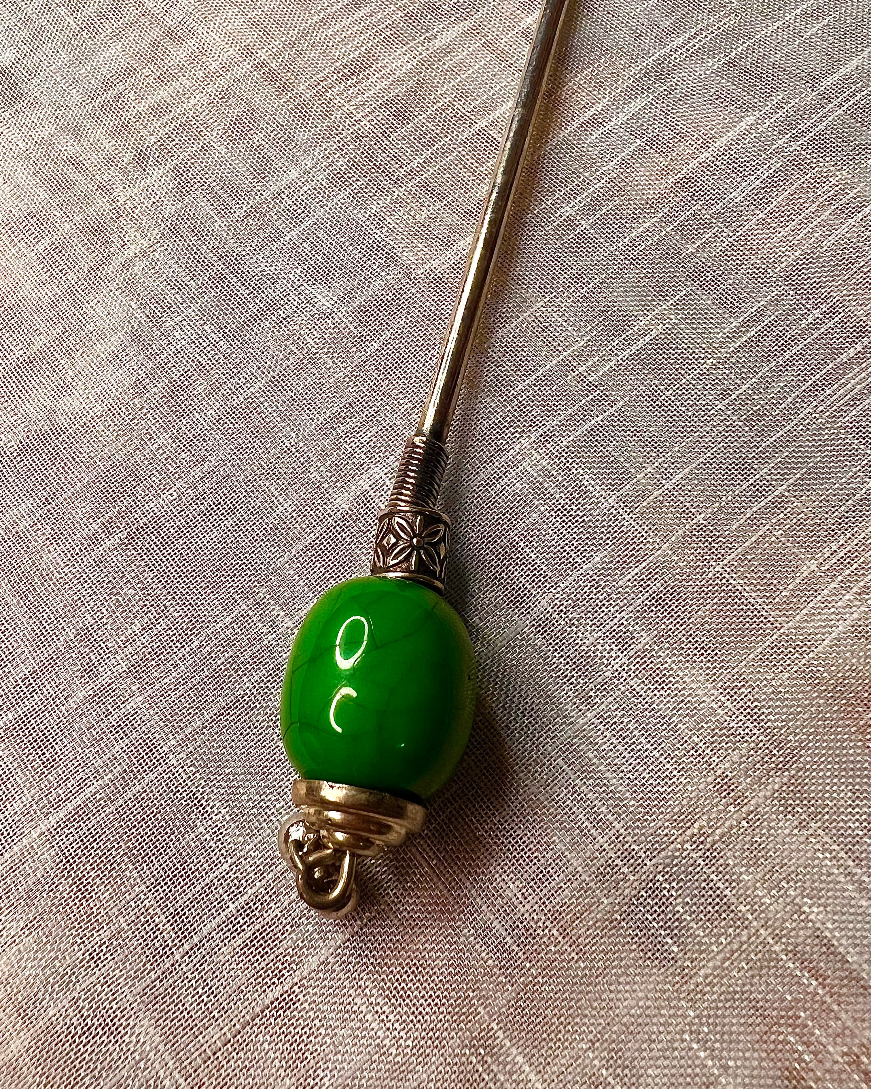 A handcrafted silver-tone hair pin finished with a deep green stone, designed to ground your look with calm, earthy elegance.
