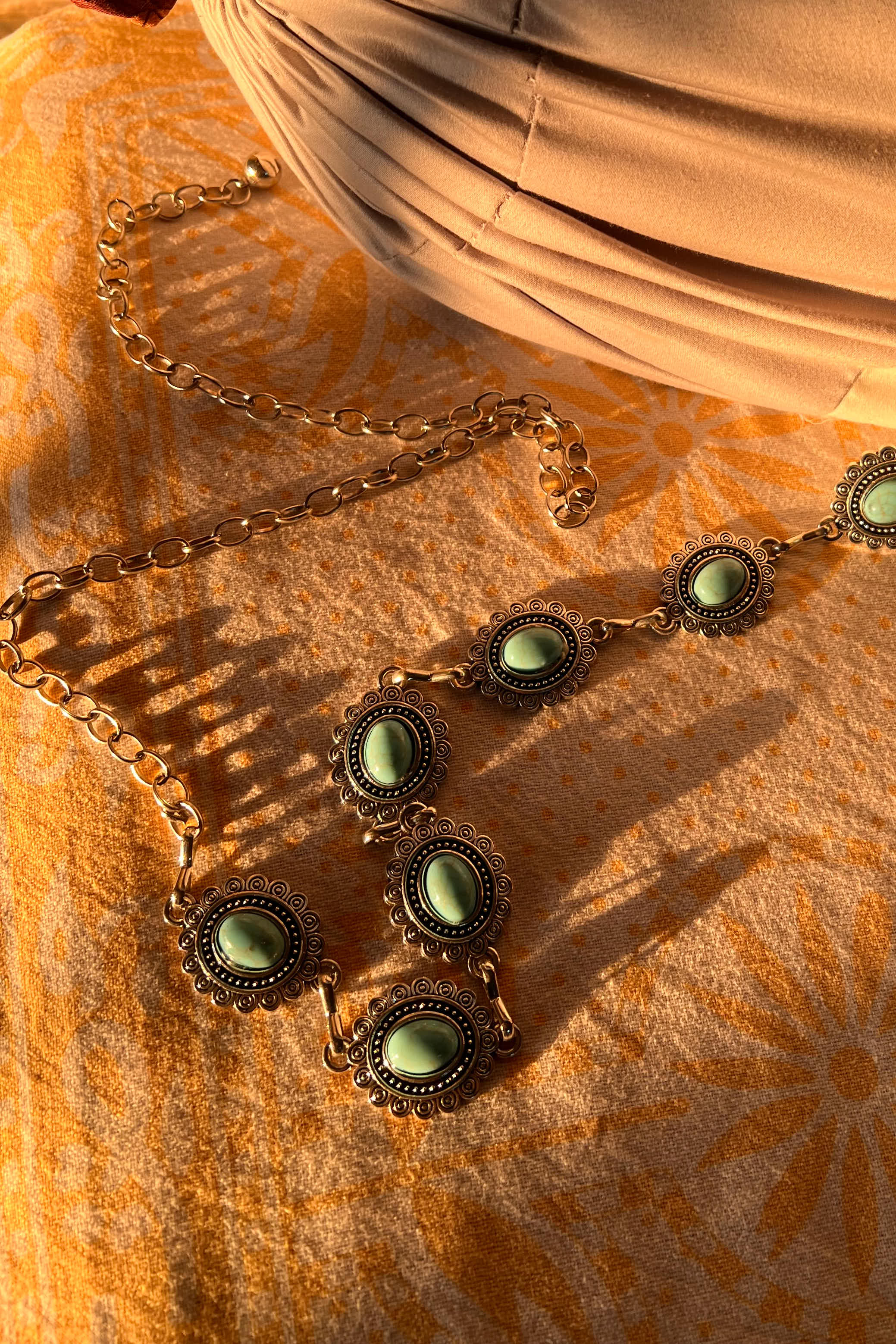 Oxidised silver–finish waist belt with oval stone motifs and adjustable chain closure.