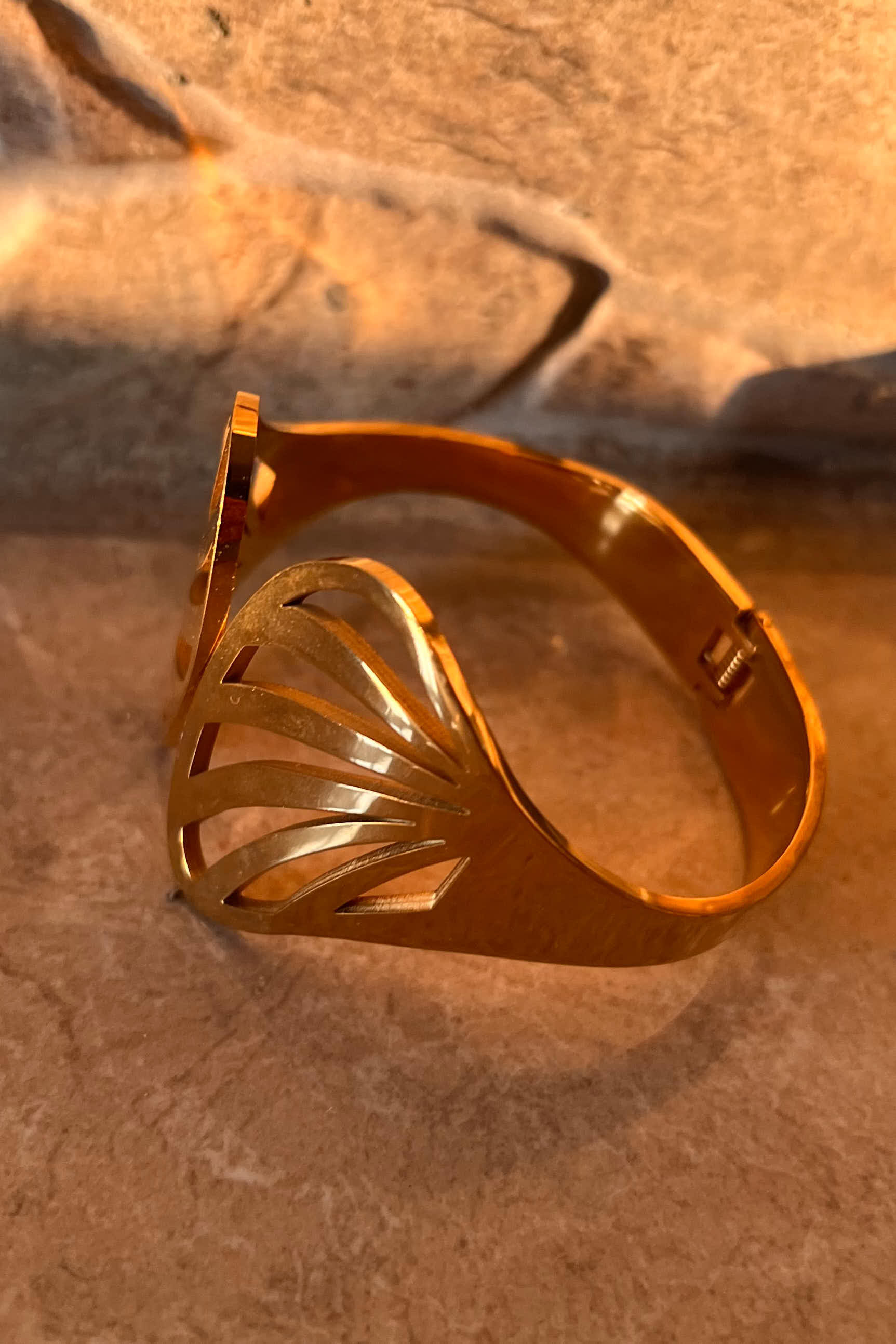 A bold gold tone statement cuff bracelet with a sculpted shell-inspired cutwork design. Perfect for boho, ethnic and indo-western styling.