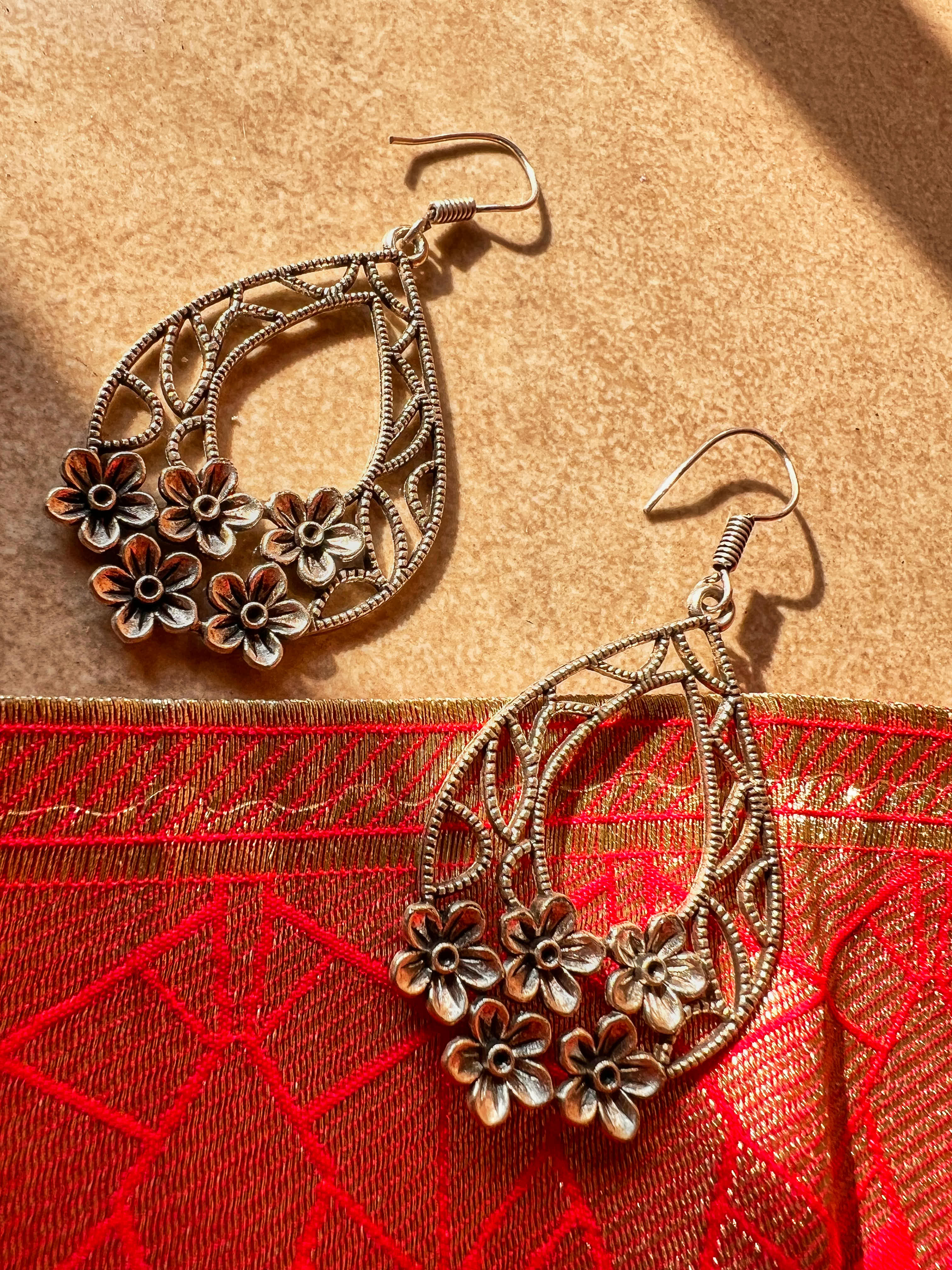 Intricate vines holding delicate blossoms — like forest flowers kissed by golden dusk. Lightweight yet statement-making, these earrings carry a quiet strength and soft grace.