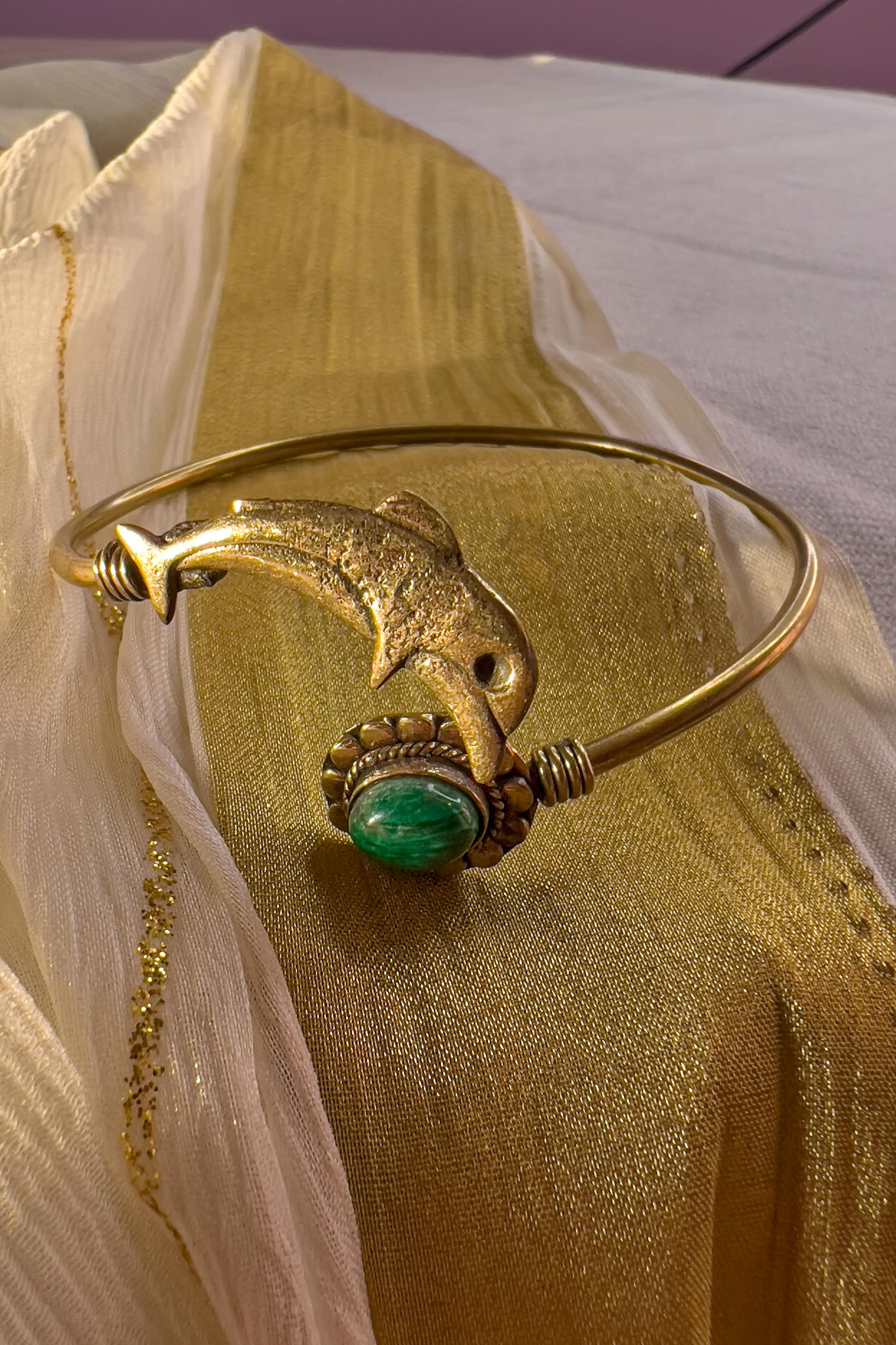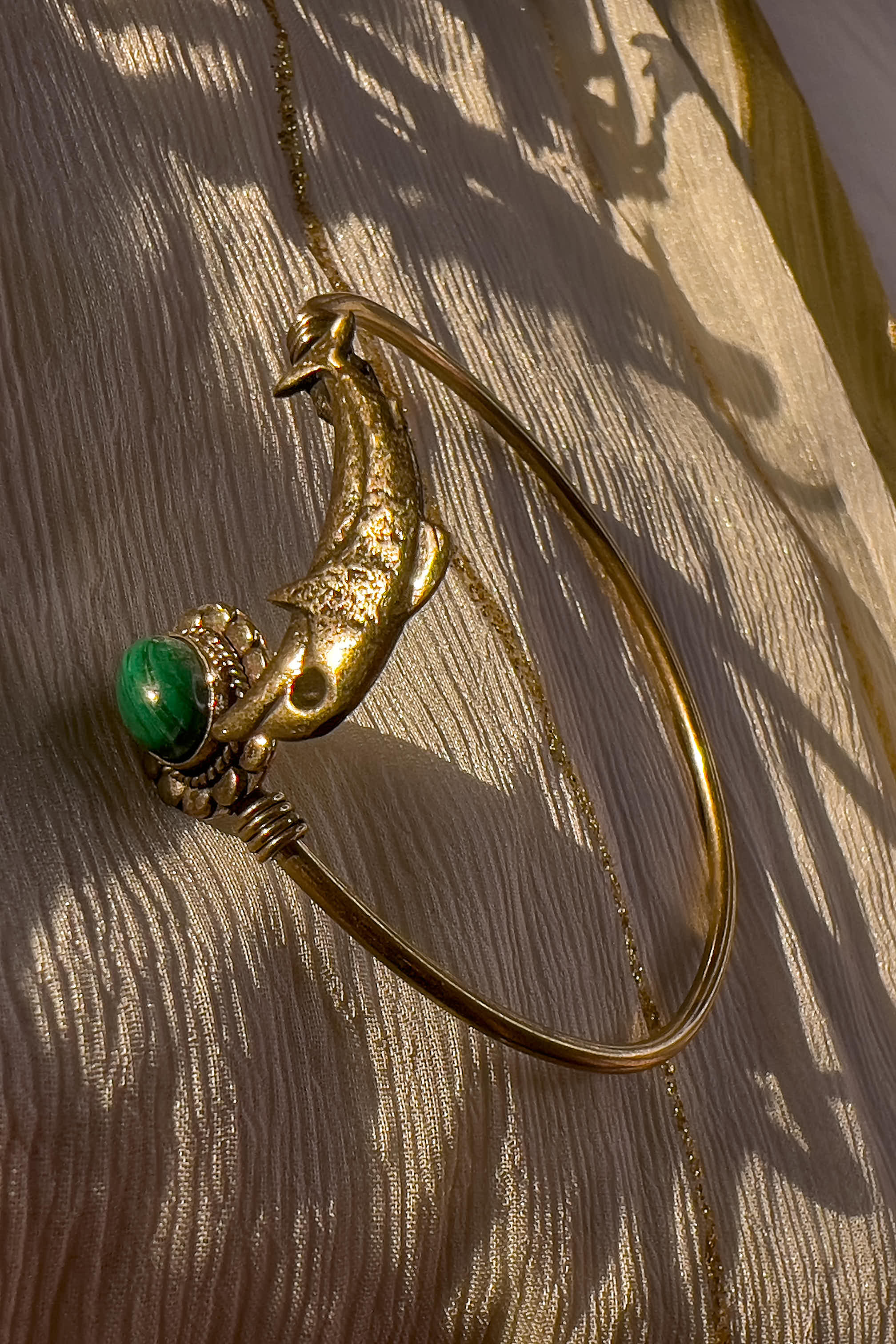 Inspired by the graceful movement of water, this cuff features a delicate fish motif paired with an earthy green stone. A symbol of abundance, flow, and harmony with nature — designed for women who move through life with quiet strength and effortless grace. Rooted in tradition, yet modern in expression.