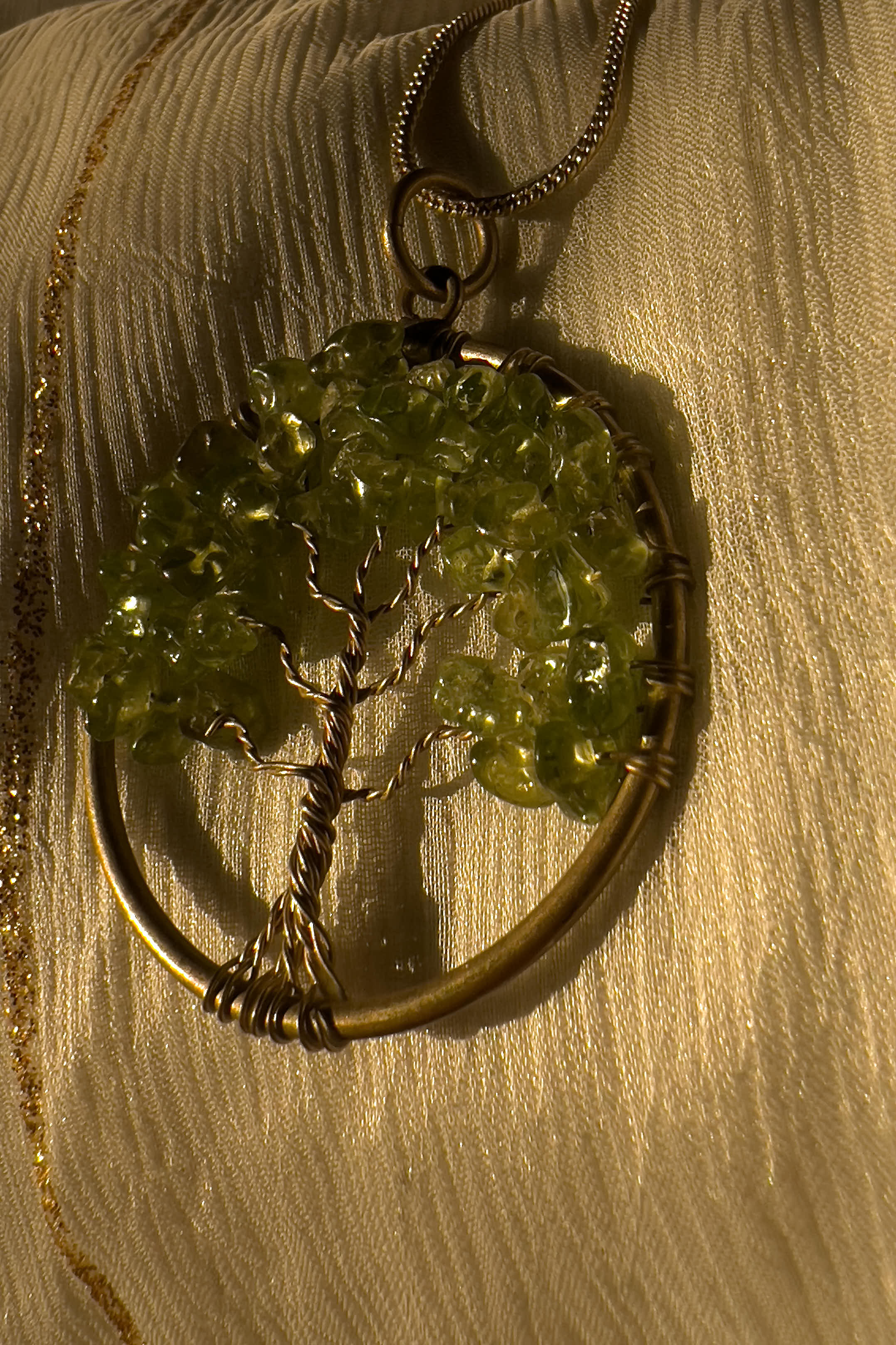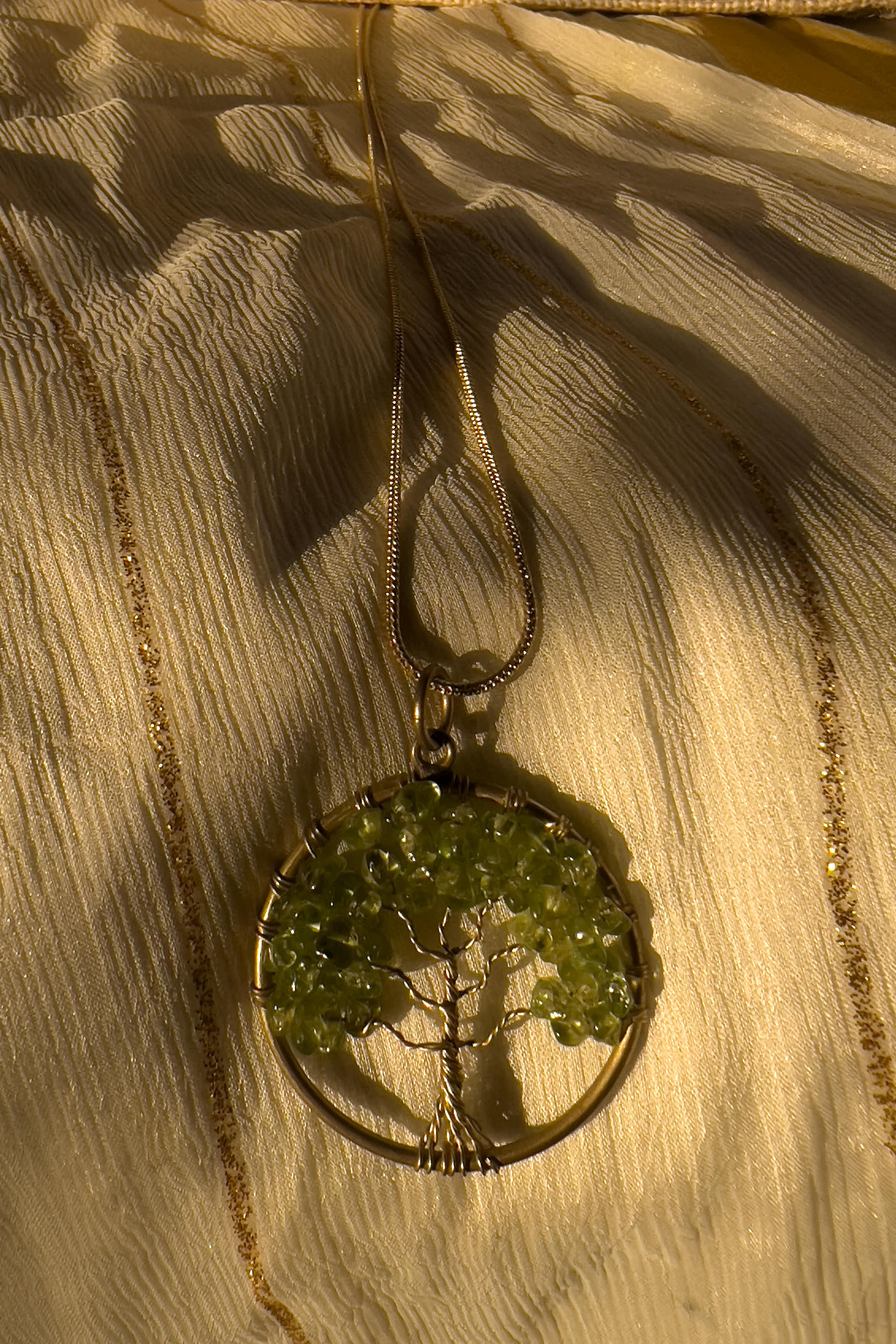 A tree of life crafted with soft green crystals, rooted in a golden circle. Symbolising growth, prosperity, and harmony with nature. This pendant reflects renewal and the quiet abundance that comes from staying grounded. Light, meaningful, and effortlessly elegant.