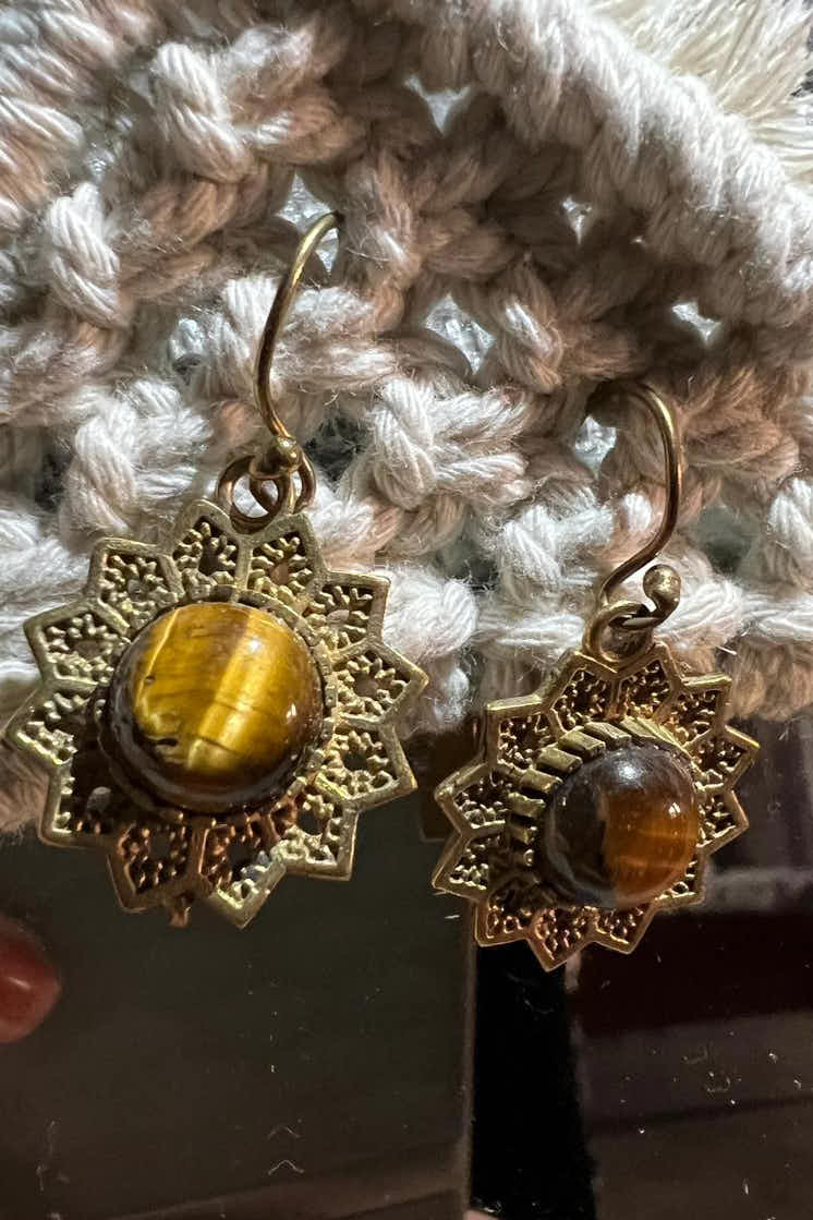 Antique gold color earrings with tiger eye stone — bold, warm, and powerfully grounded.