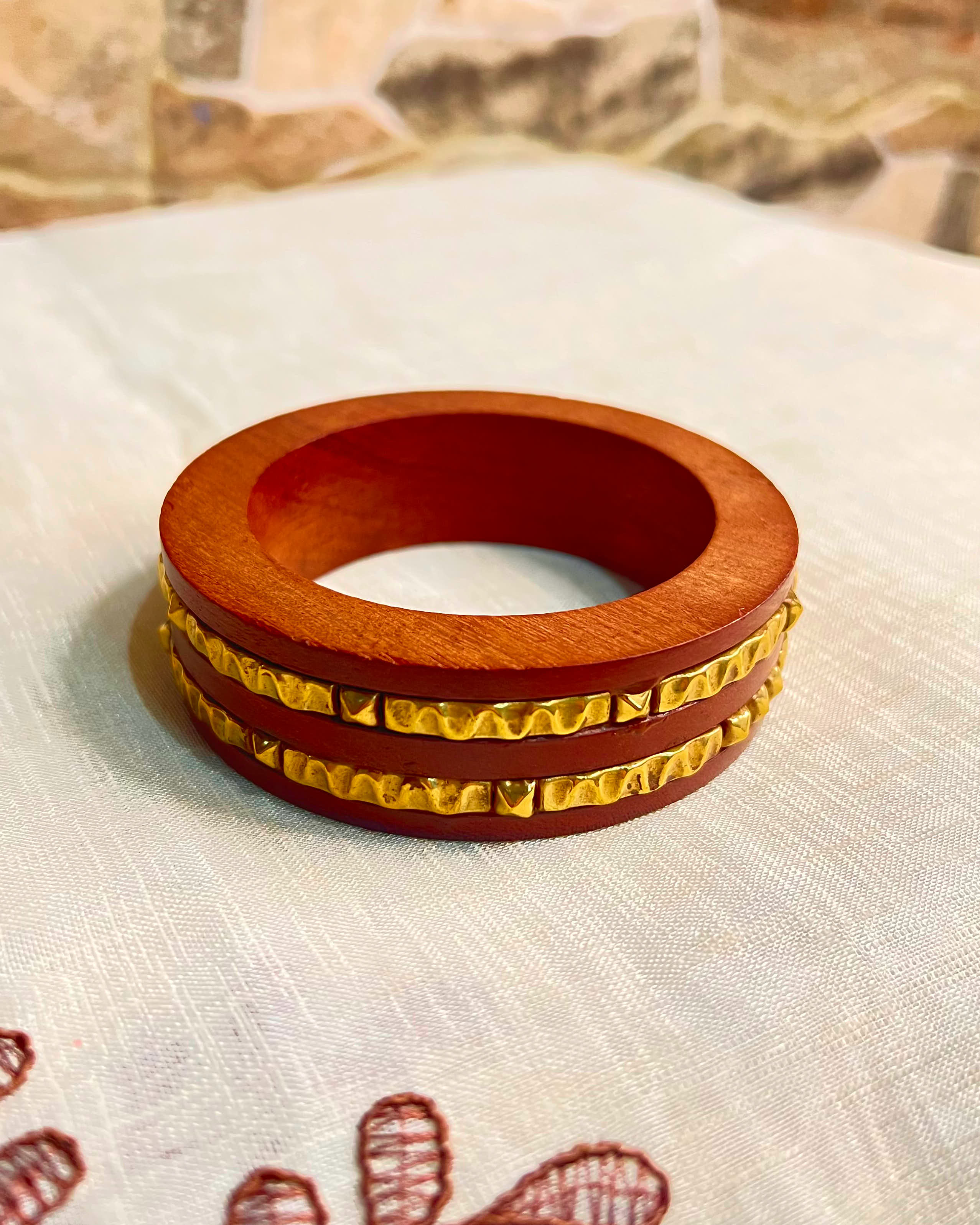 A bold wooden bangle accented with dual gold-toned detailing, designed to make a quiet yet confident statement.