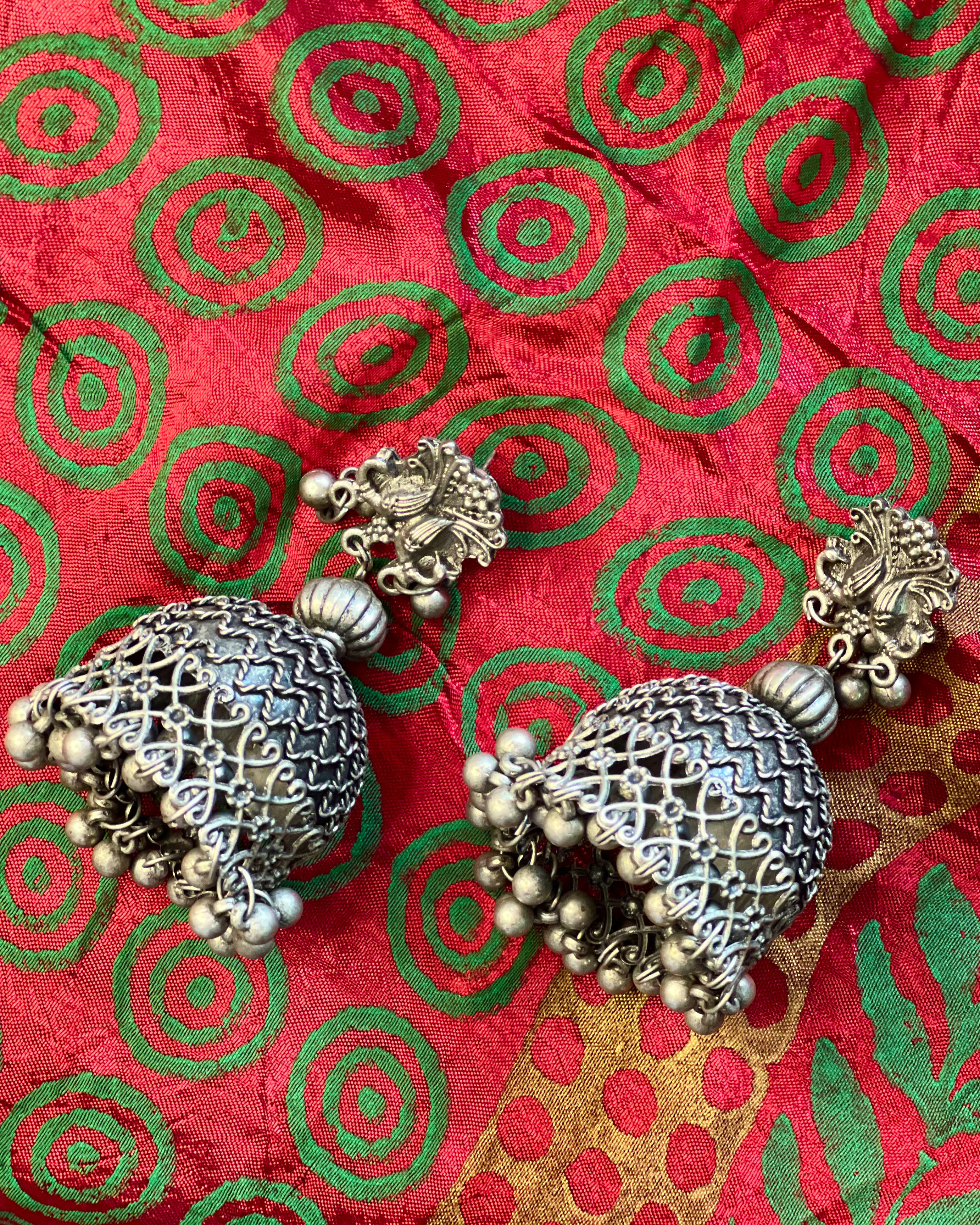 Statement silver-toned jhumkas with intricate lattice detailing and soft ghungroo accents.