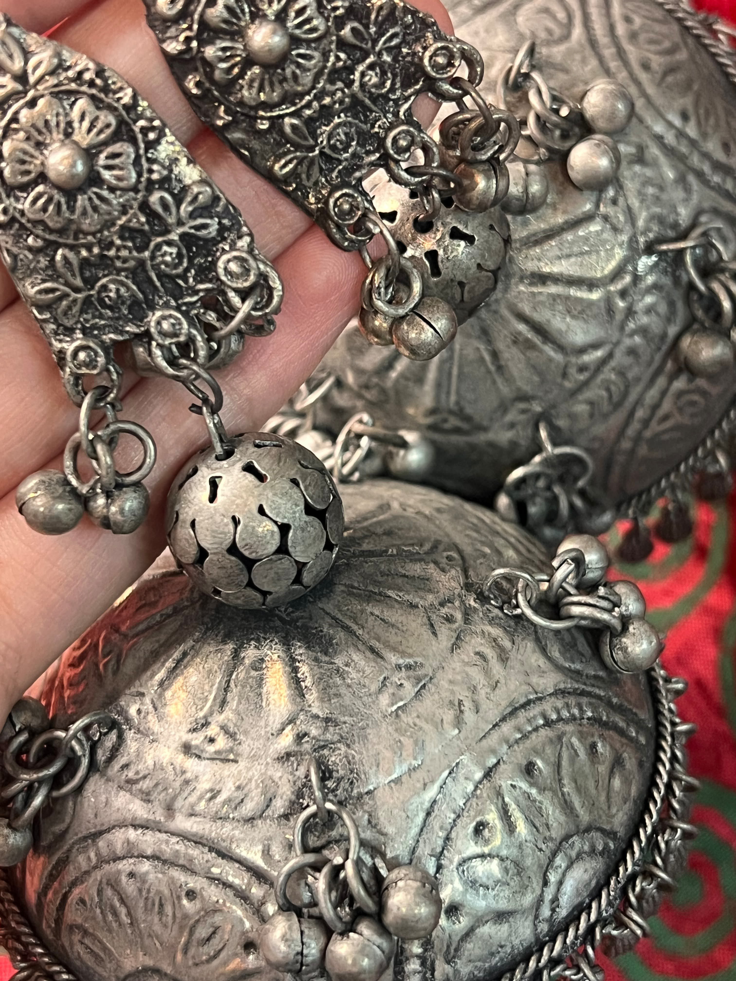 Statement silver-toned jhumkas with intricate detailing and layered ghungroo accents.