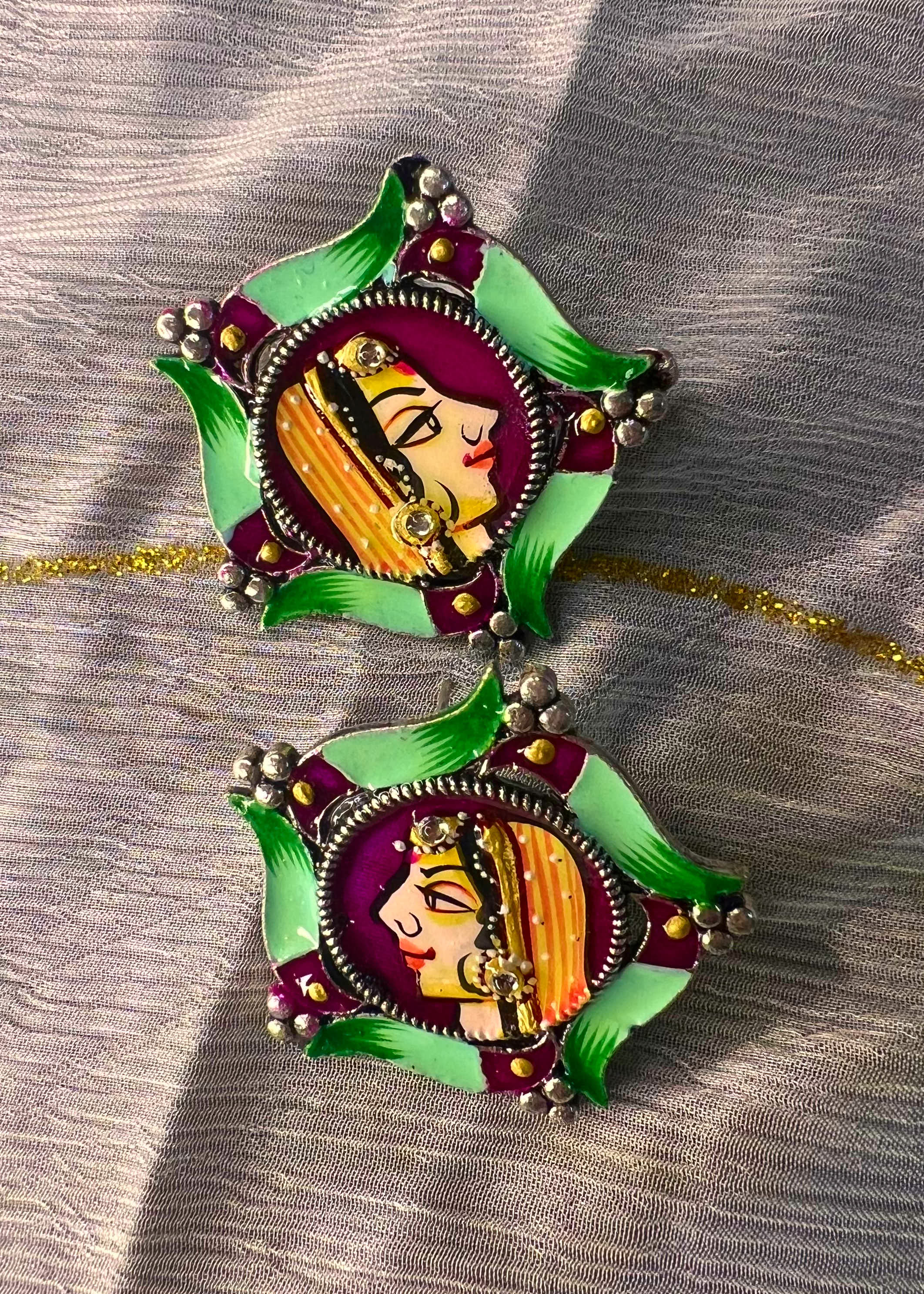 Hand-painted earrings featuring a traditional feminine portrait framed in vibrant, handcrafted detailing.