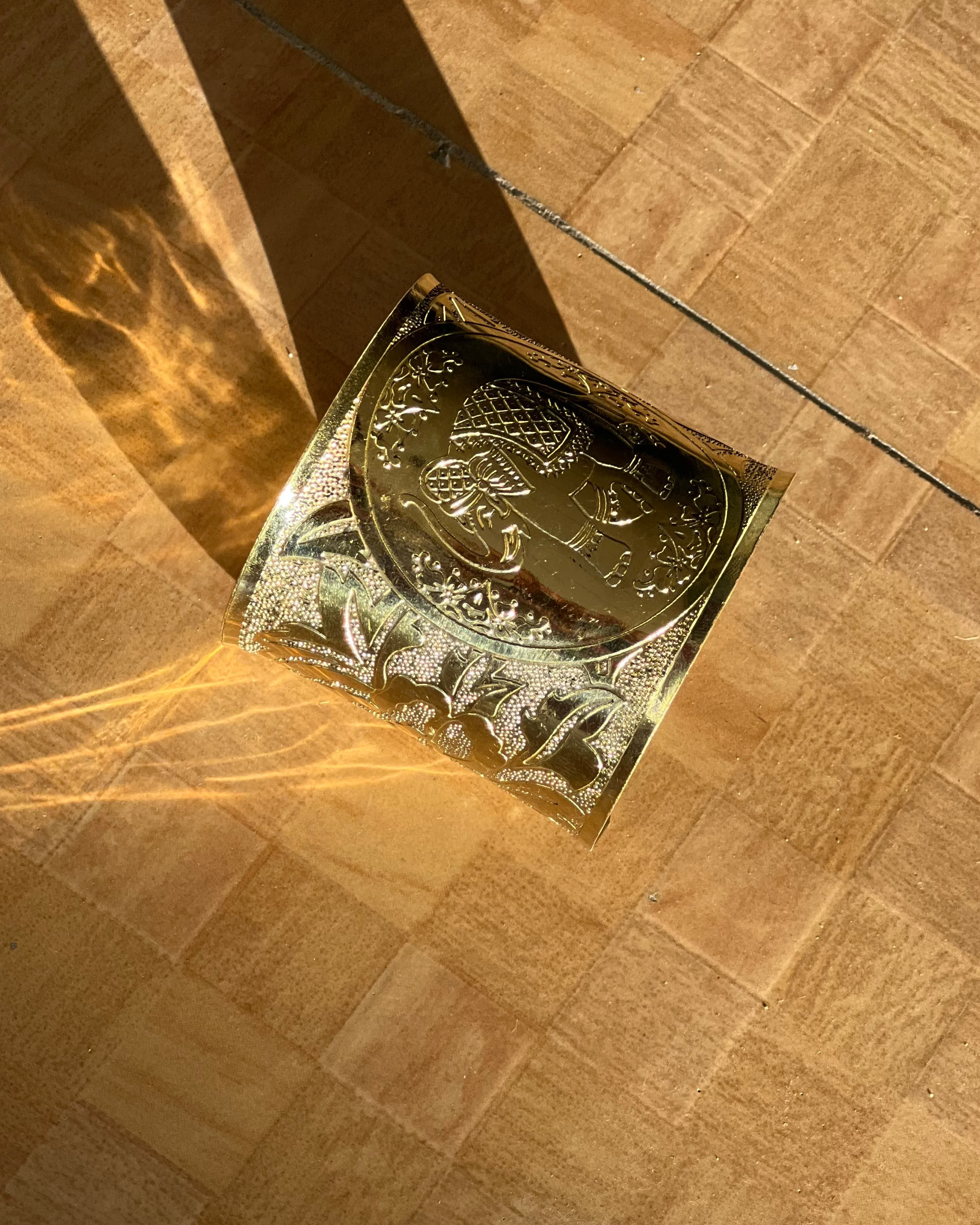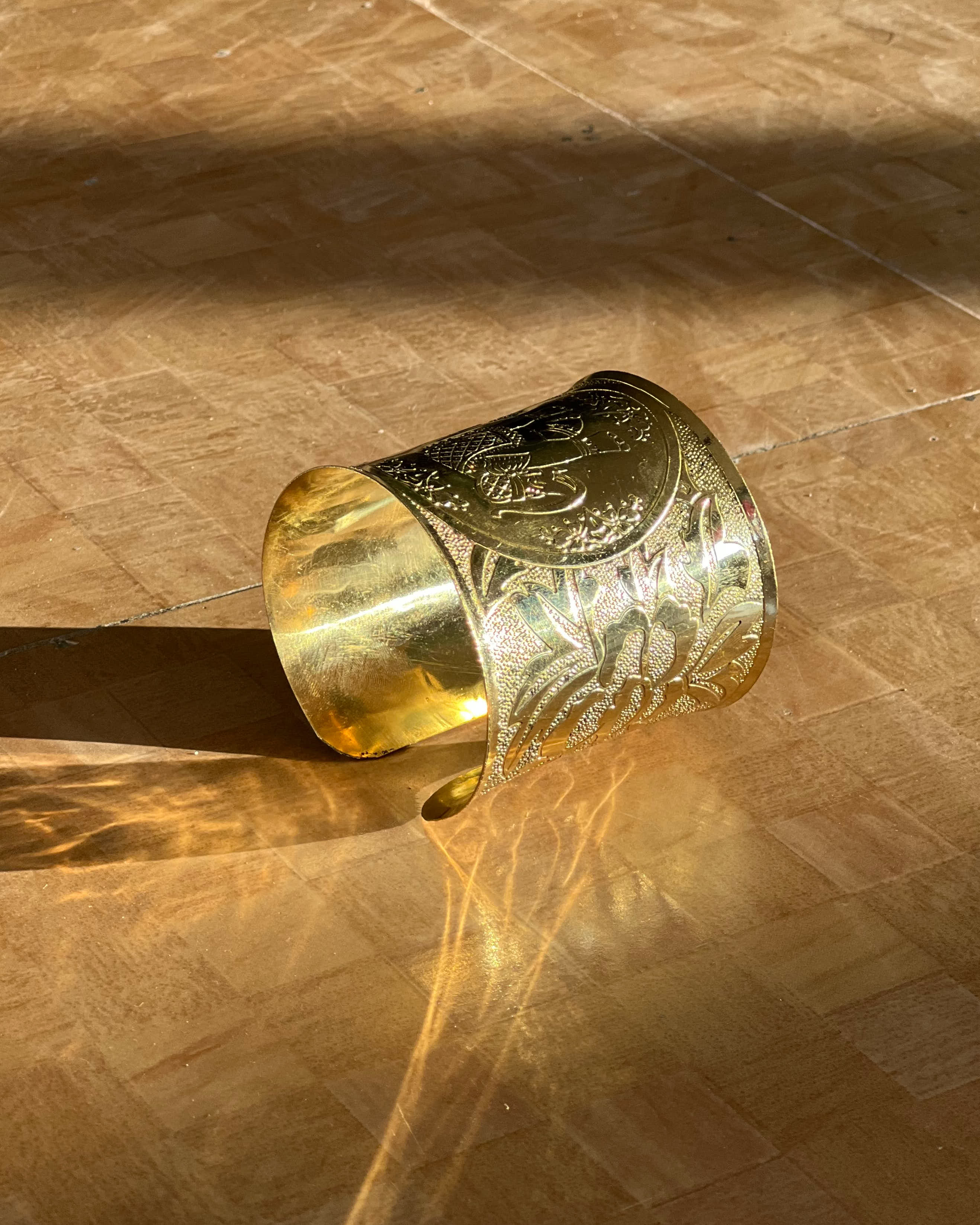 A wide engraved gold-toned cuff featuring intricate floral detailing and a bold open silhouette.
