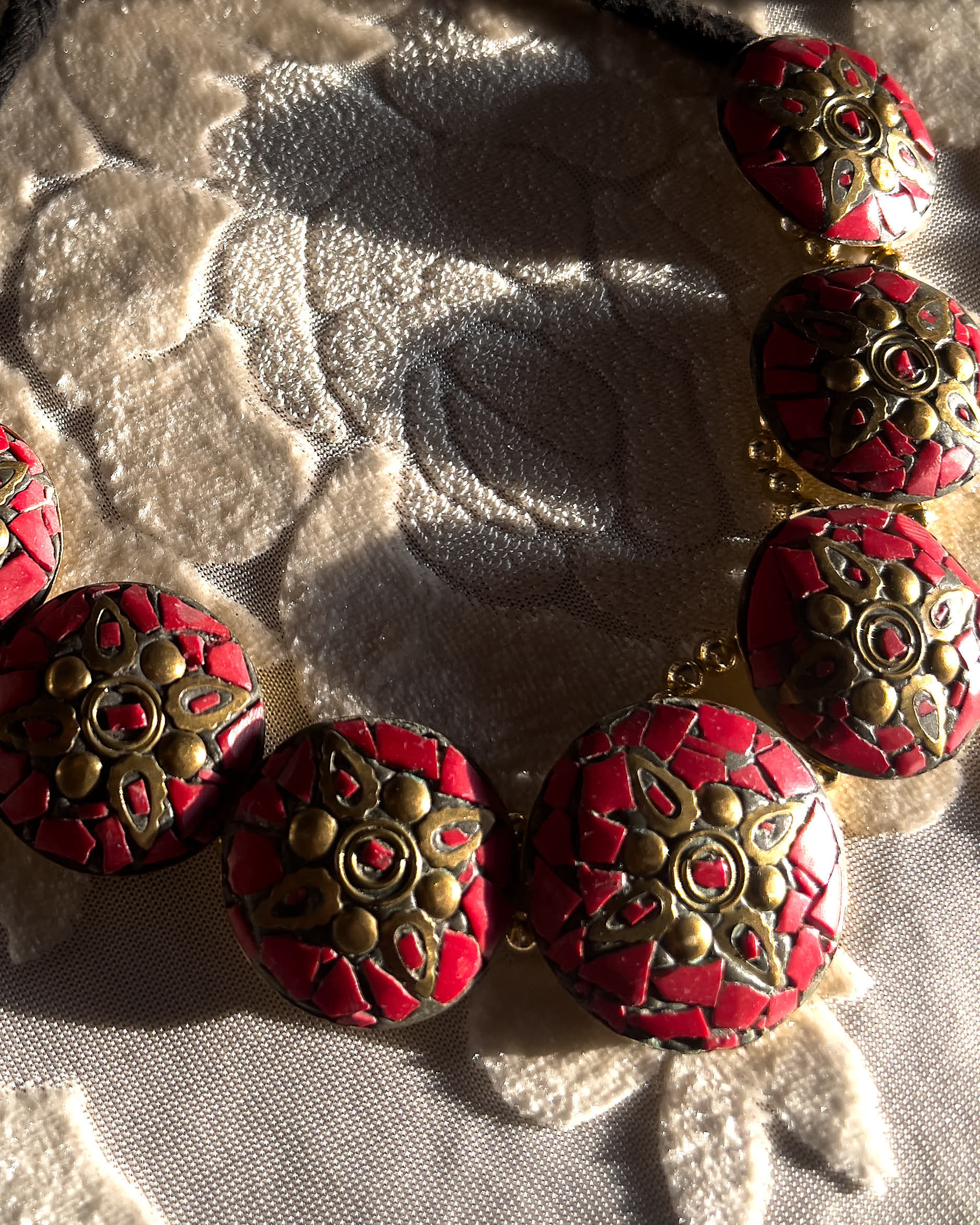 Handcrafted red-and-gold motif necklace on an adjustable black thread.