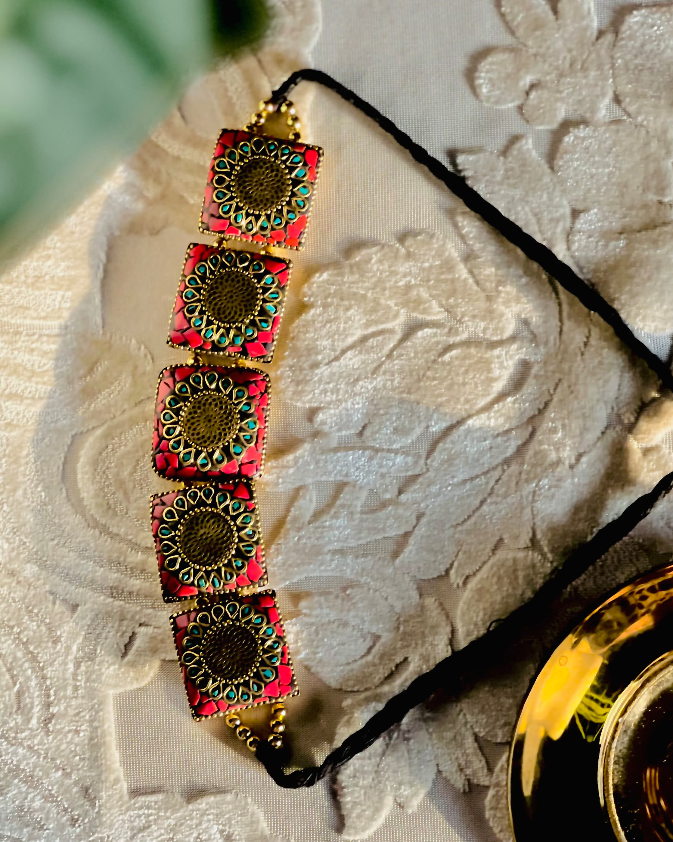 Red mosaic square-motif necklace with antique gold mandala detailing on an adjustable black thread.