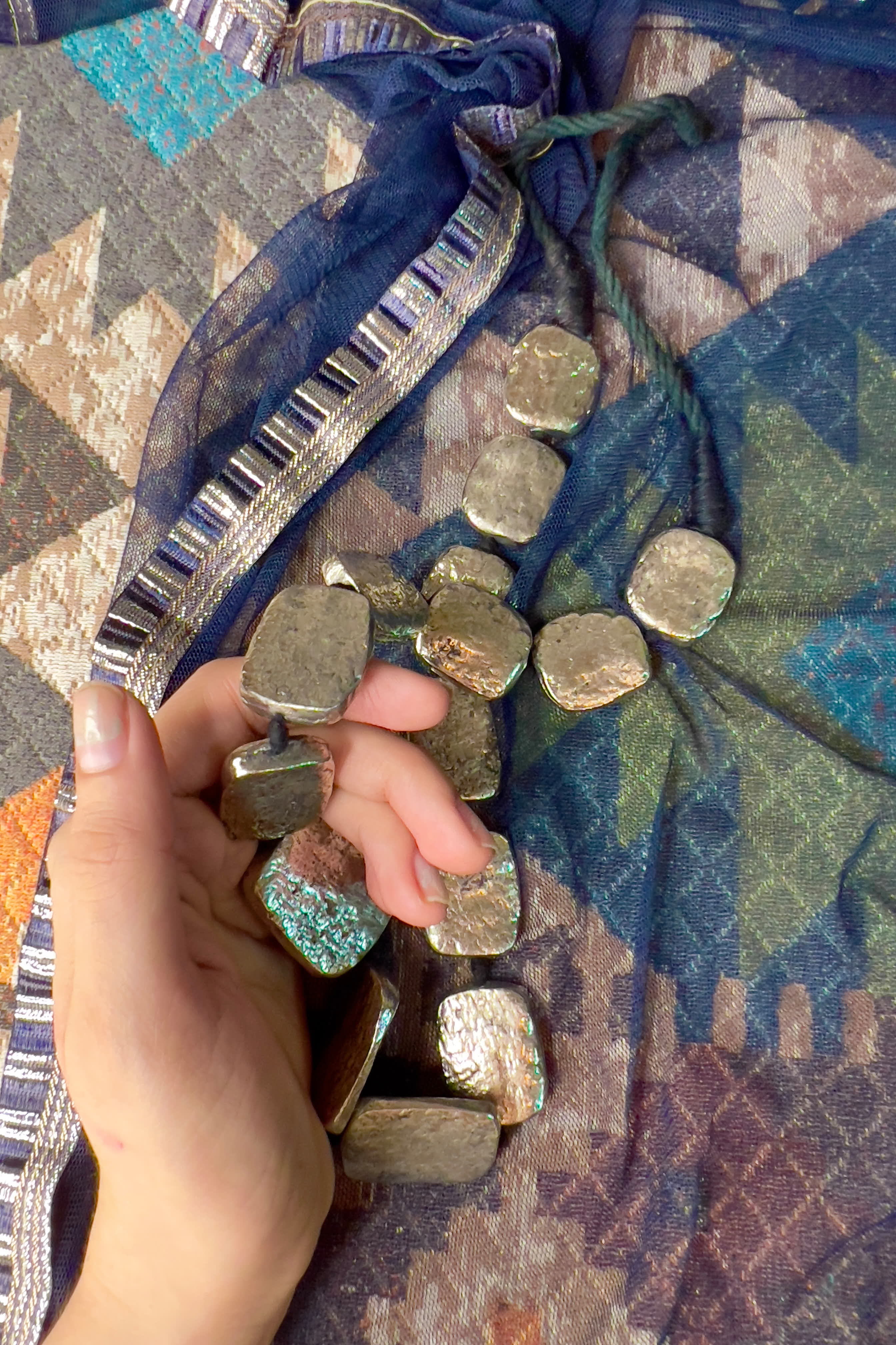 Hand-textured silver-tone stone necklace with an adjustable thread closure.