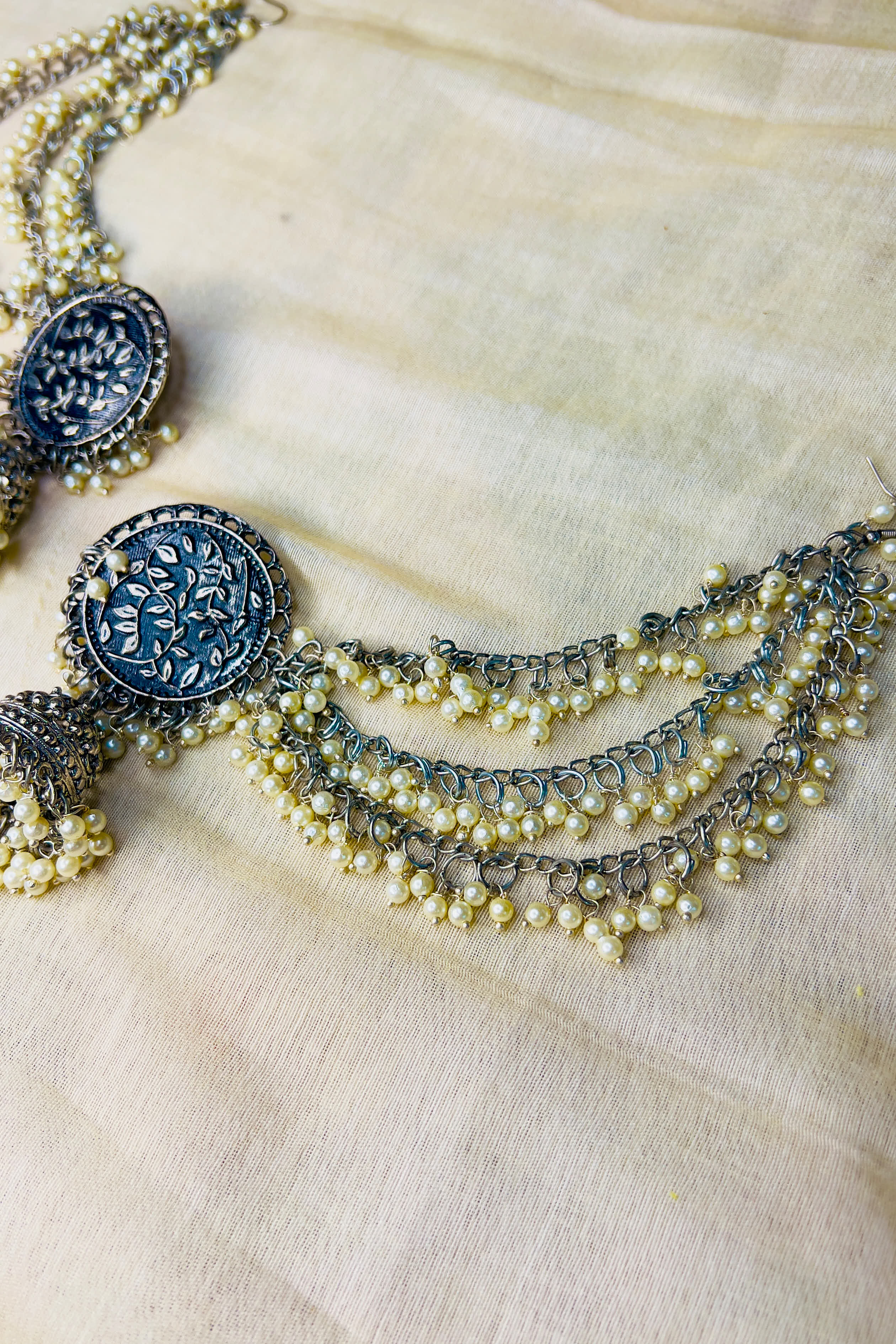 Silver-tone oxidised jhumki earrings with layered pearl chains and engraved medallion.