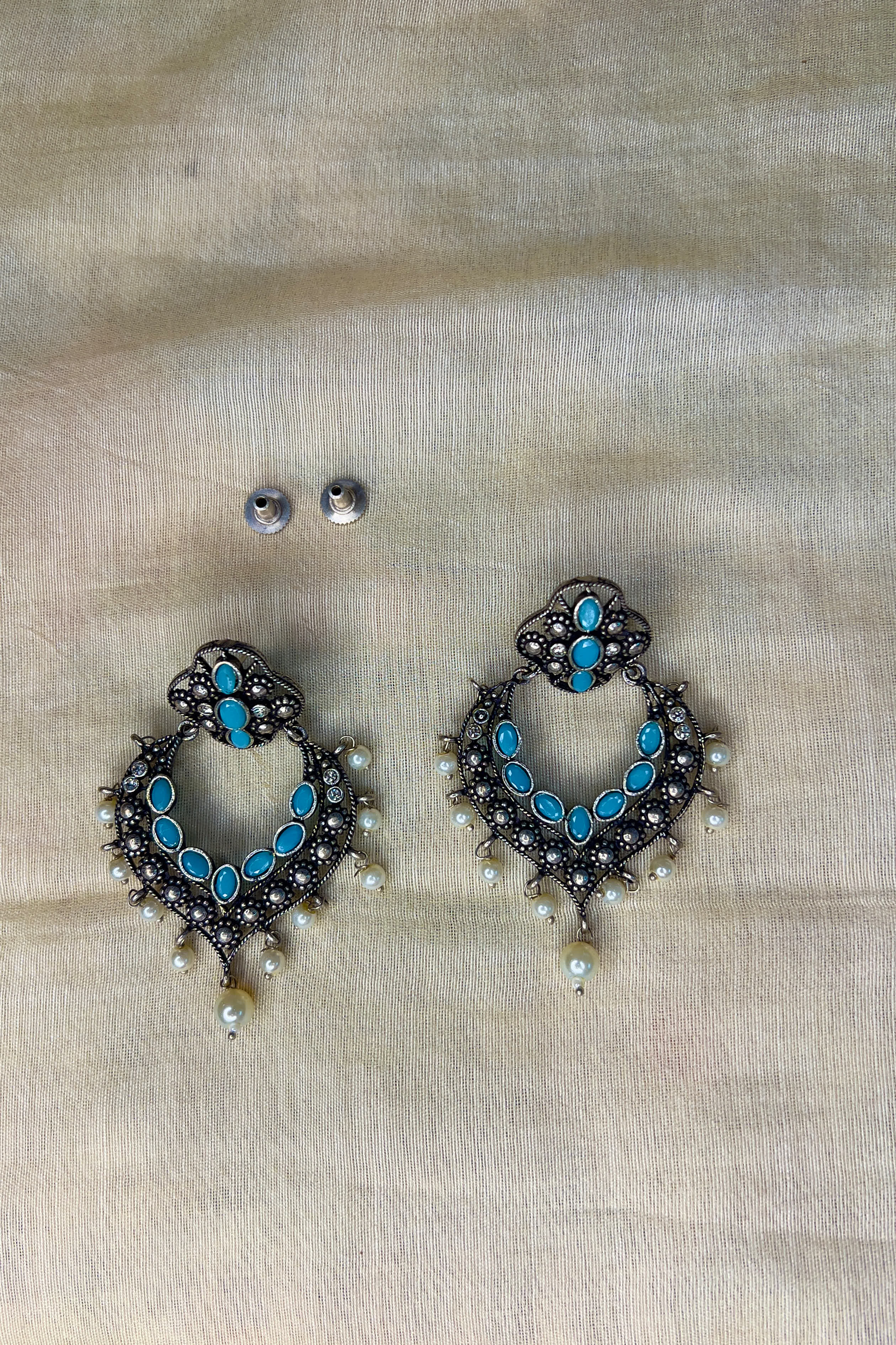 Silver-tone oxidised earrings with turquoise stones and pearl drops.