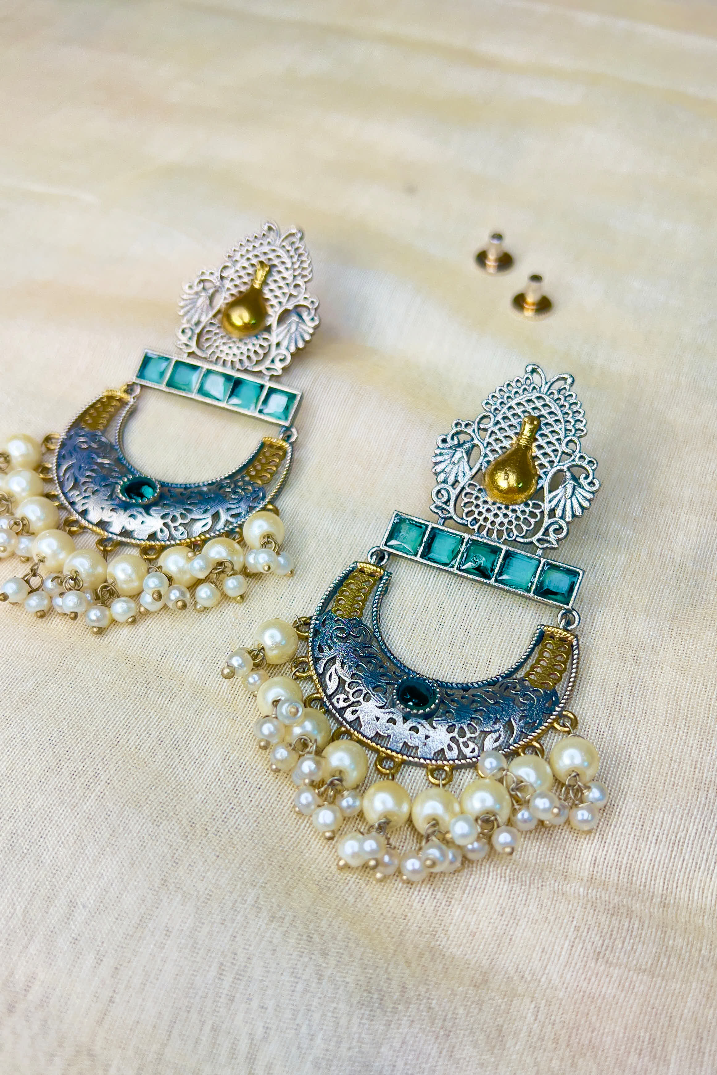 Oxidised silver-tone crescent earrings with green stones and pearl clusters.