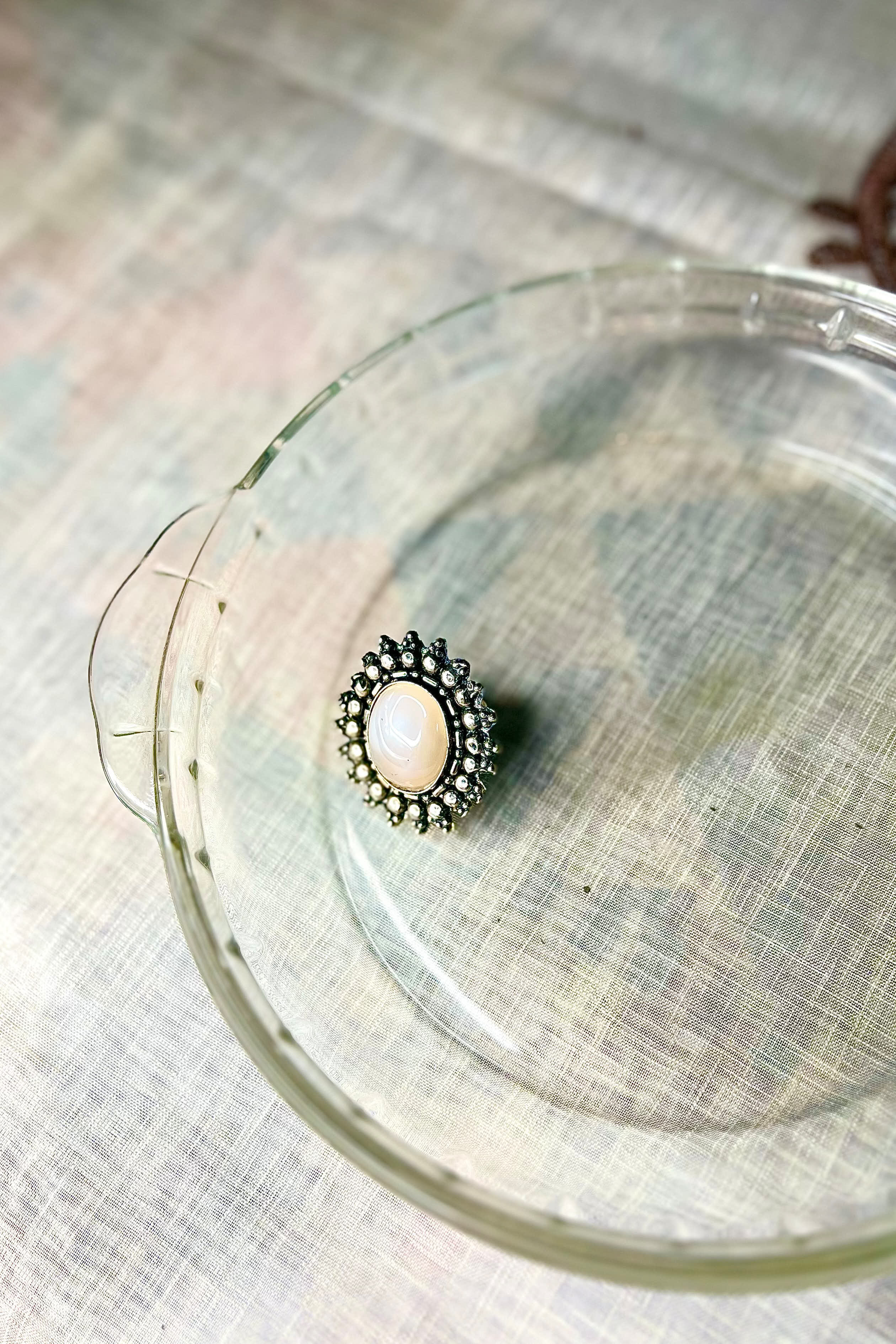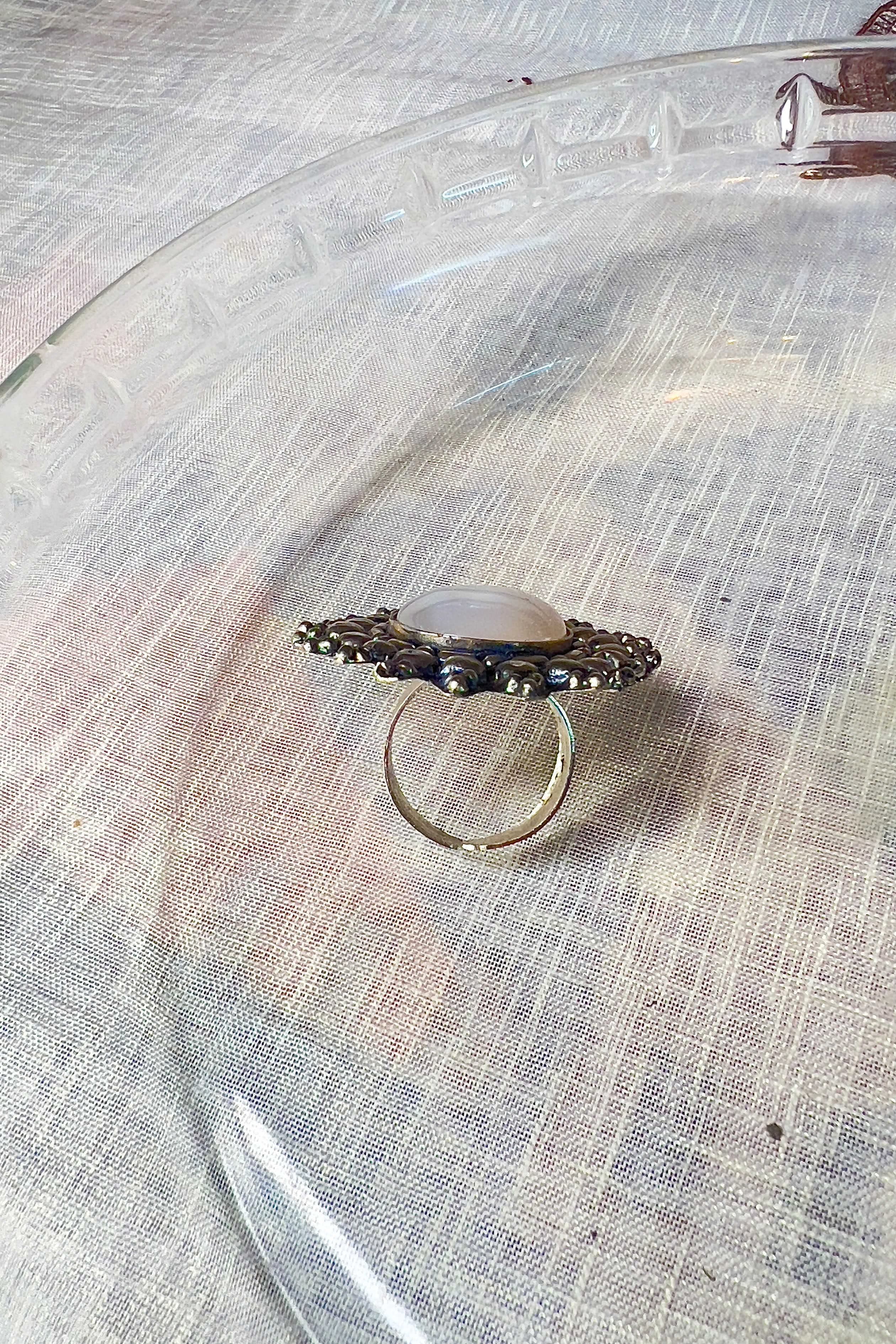 A handcrafted ring featuring a soft ivory-toned stone framed by antique silver detailing, timeless and quietly striking.