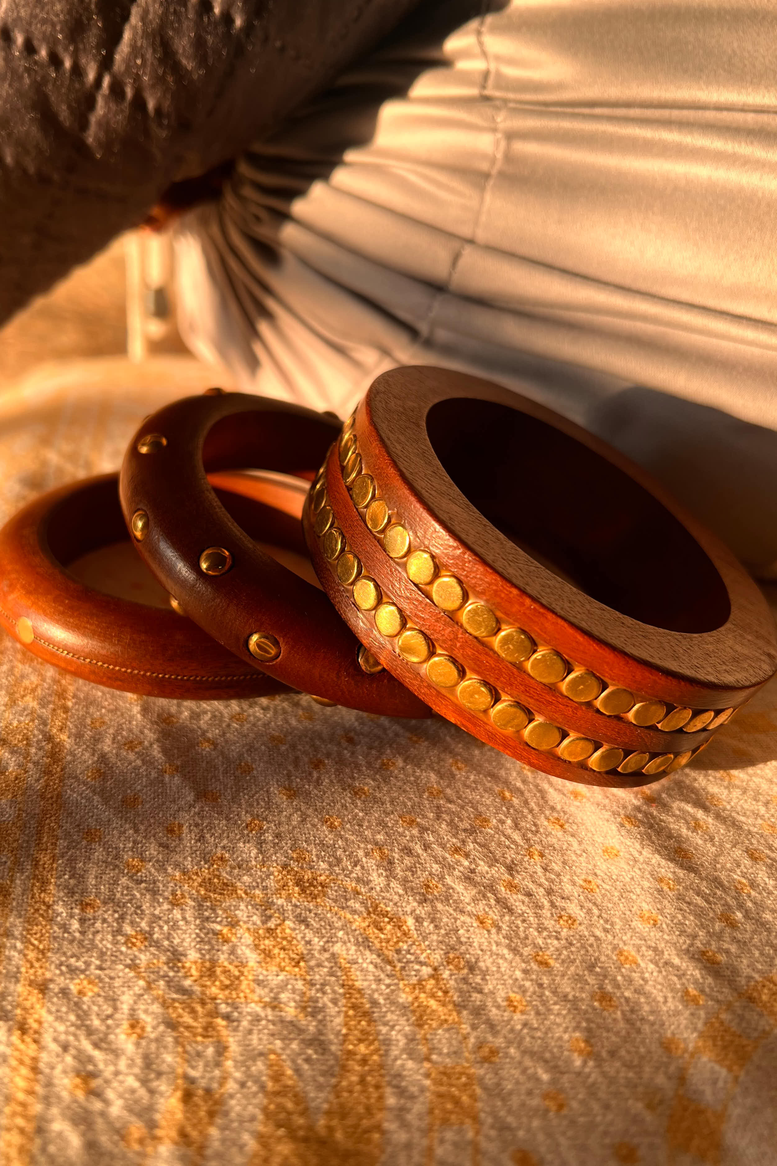 A set of handcrafted wooden bangles detailed with brass accents, blending warm natural tones with subtle metallic character.