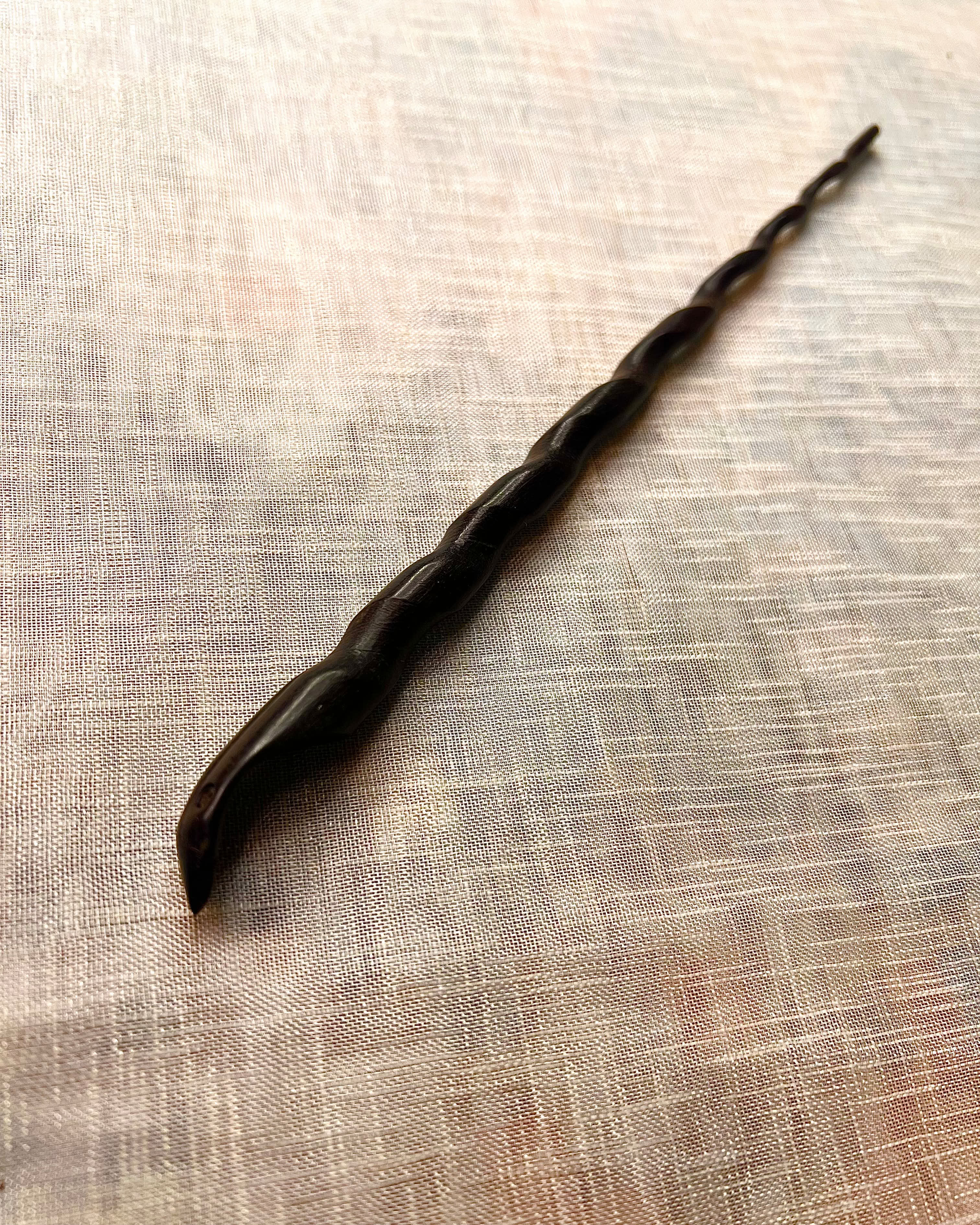 A minimalist, hand-carved wooden hair stick with a natural spiral form, designed to secure buns effortlessly while adding an earthy, timeless touch.
