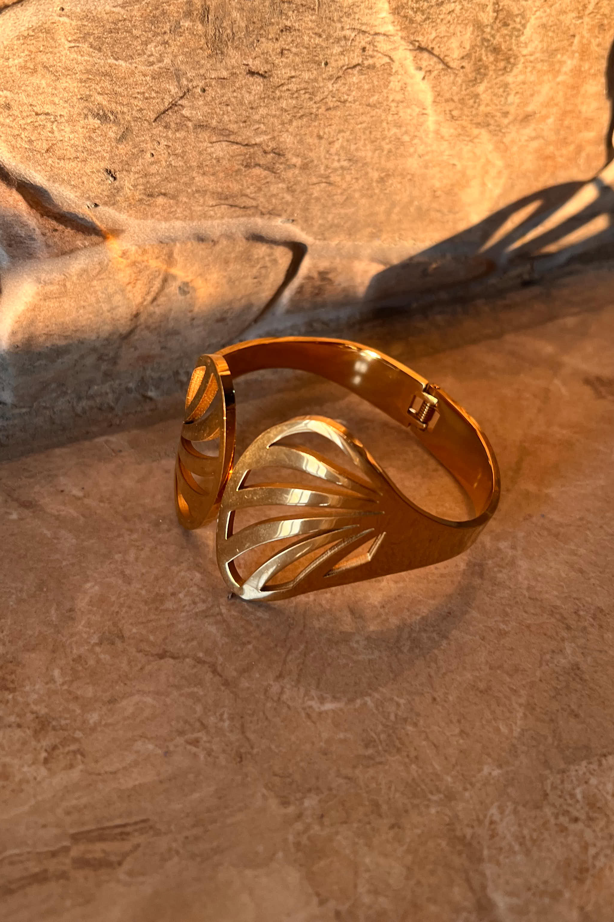 A bold gold tone statement cuff bracelet with a sculpted shell-inspired cutwork design. Perfect for boho, ethnic and indo-western styling.