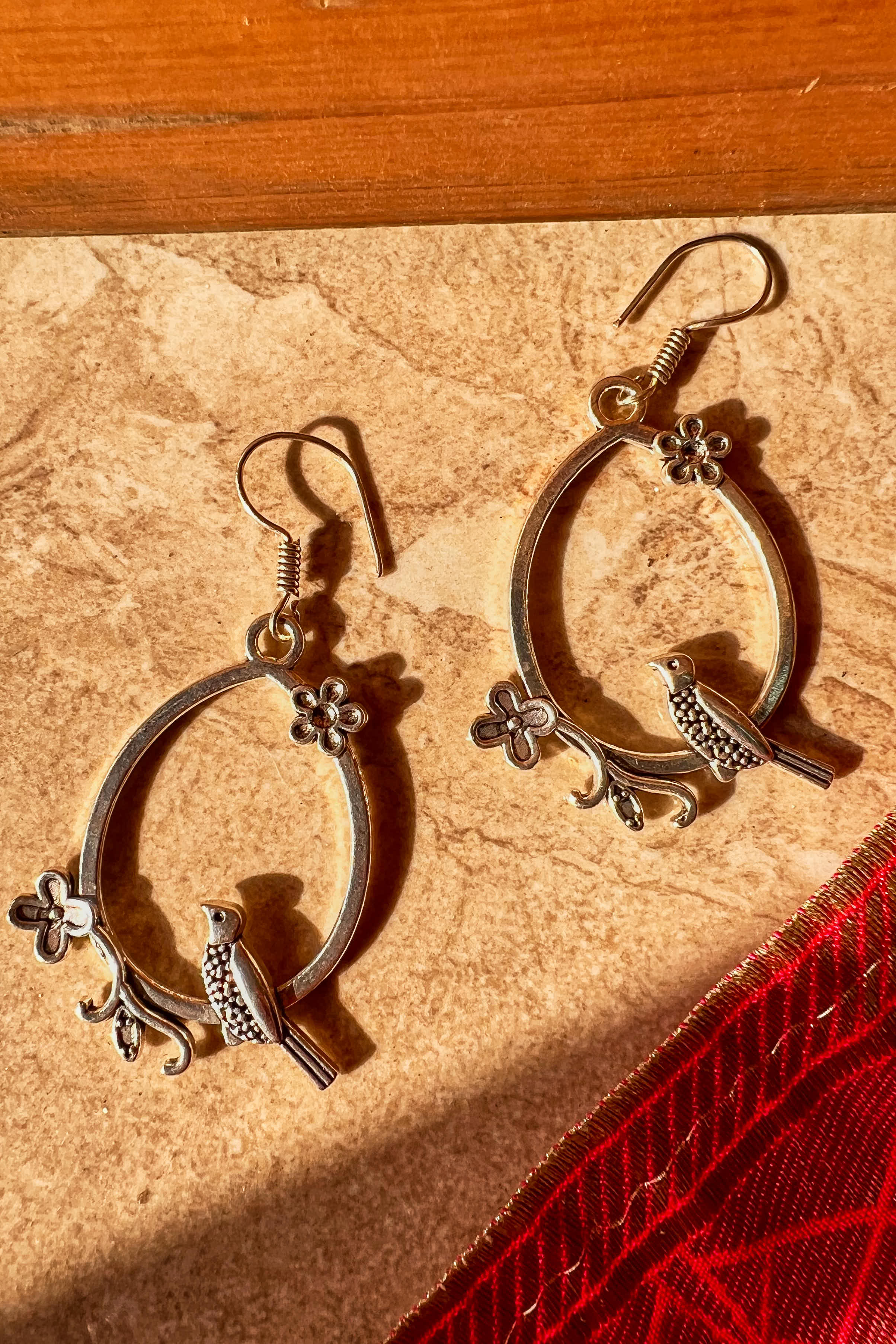 A quiet bird resting within wild vines — symbol of freedom that chooses to stay rooted. These hoops carry forest calm and open-sky courage. Earthy gold tone, delicate detailing, light yet powerful. Not loud. Just quietly expressive.