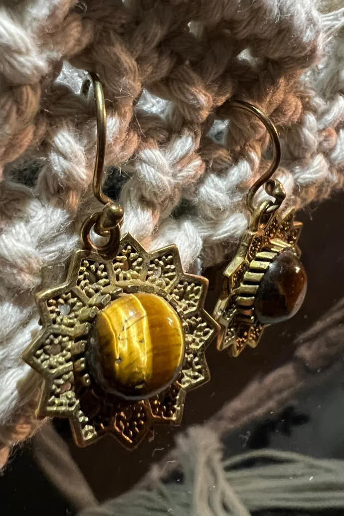 Antique gold color earrings with tiger eye stone — bold, warm, and powerfully grounded.