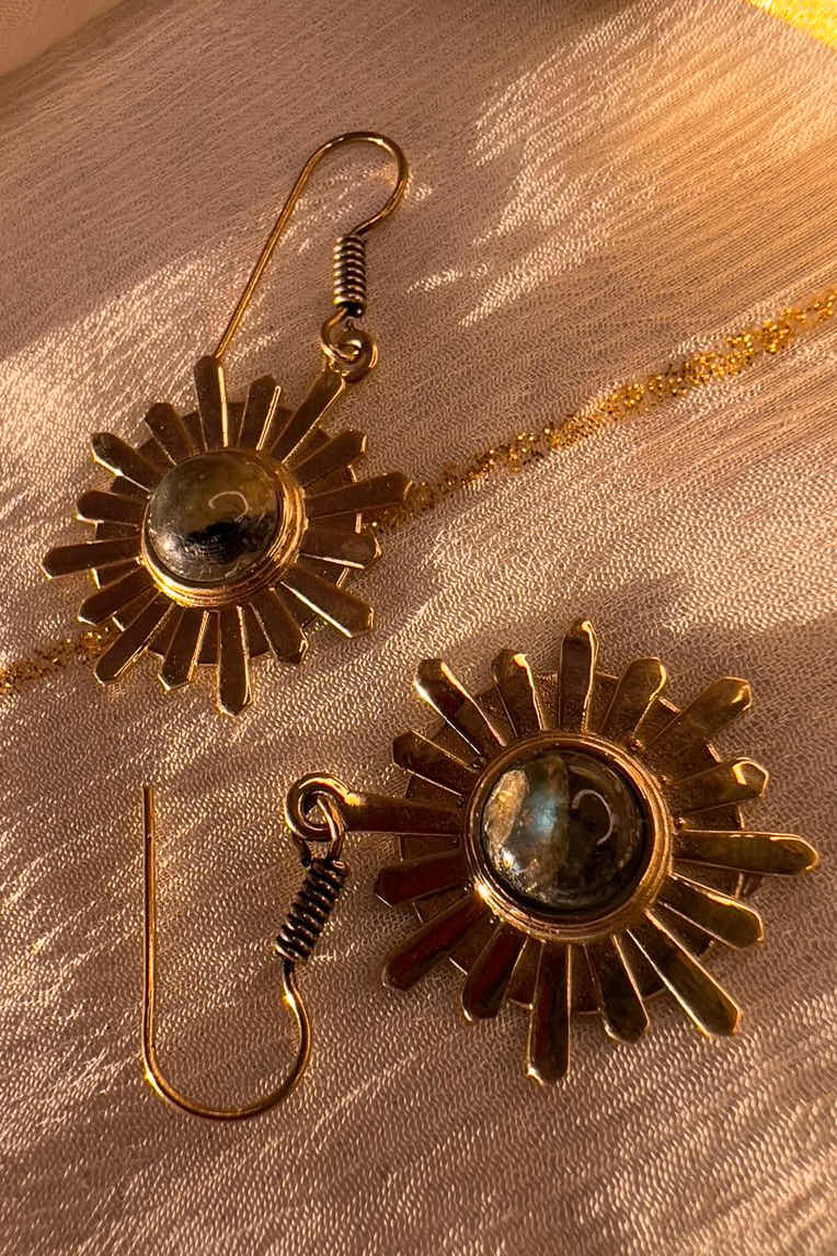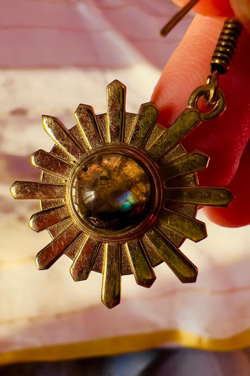 Antique gold sunburst earrings with a labradorite glow — shifting, mystical, and quietly radiant.