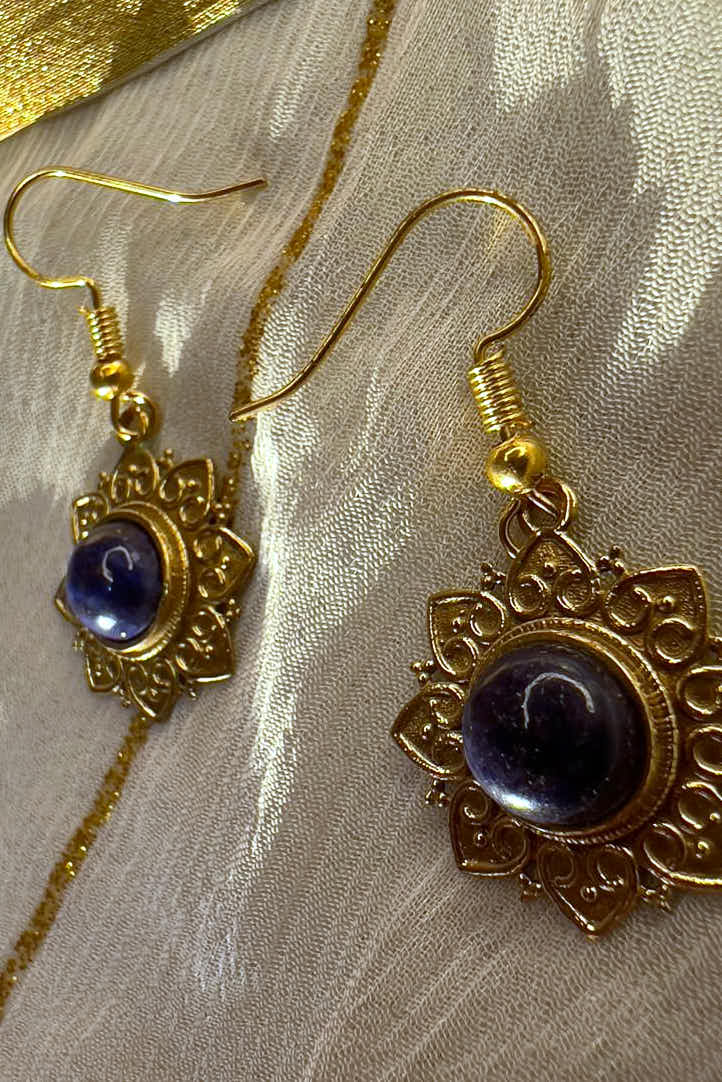 Antique gold earrings with a deep blue stone — serene, rich, and quietly striking.