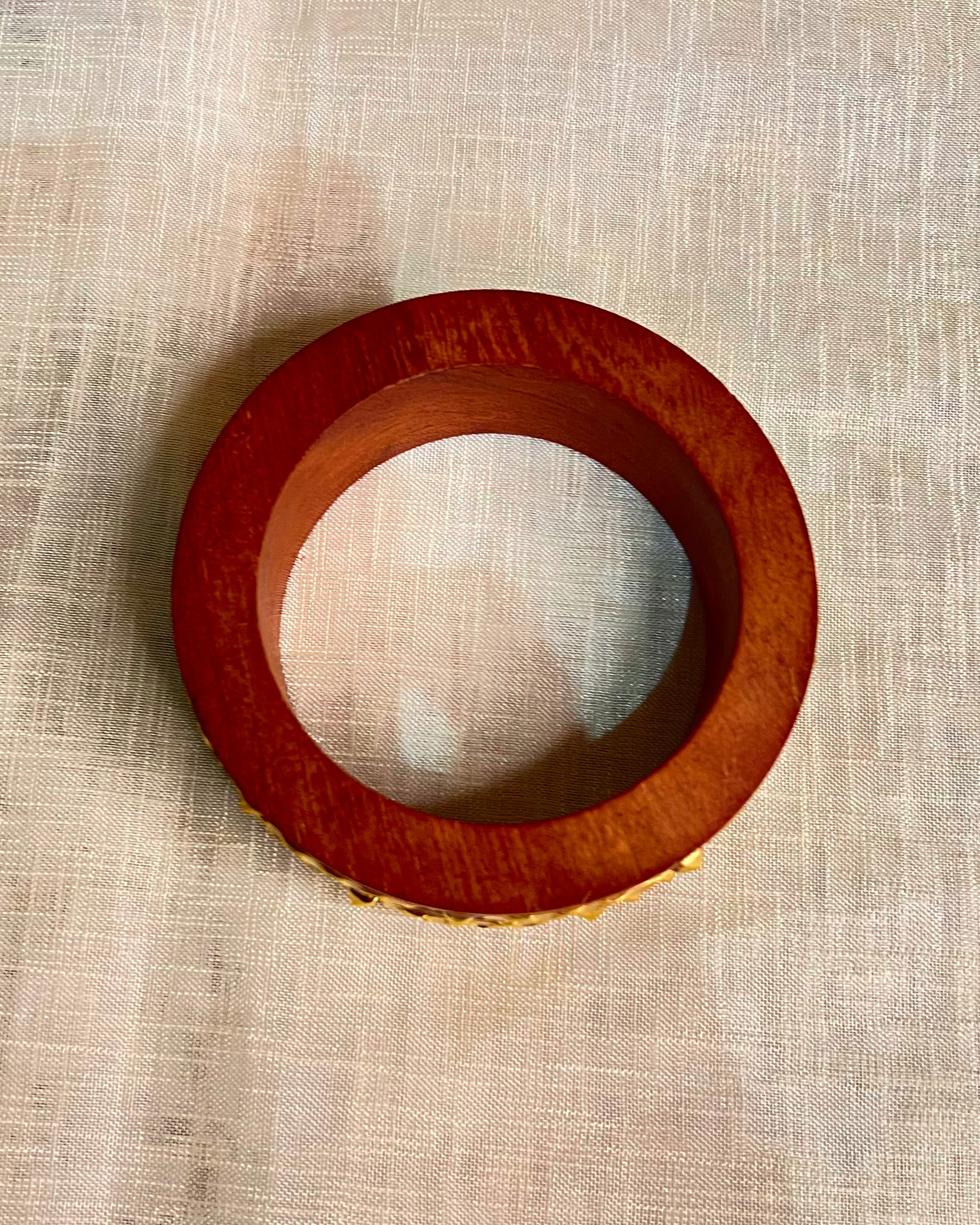 A bold wooden bangle accented with dual gold-toned detailing, designed to make a quiet yet confident statement.