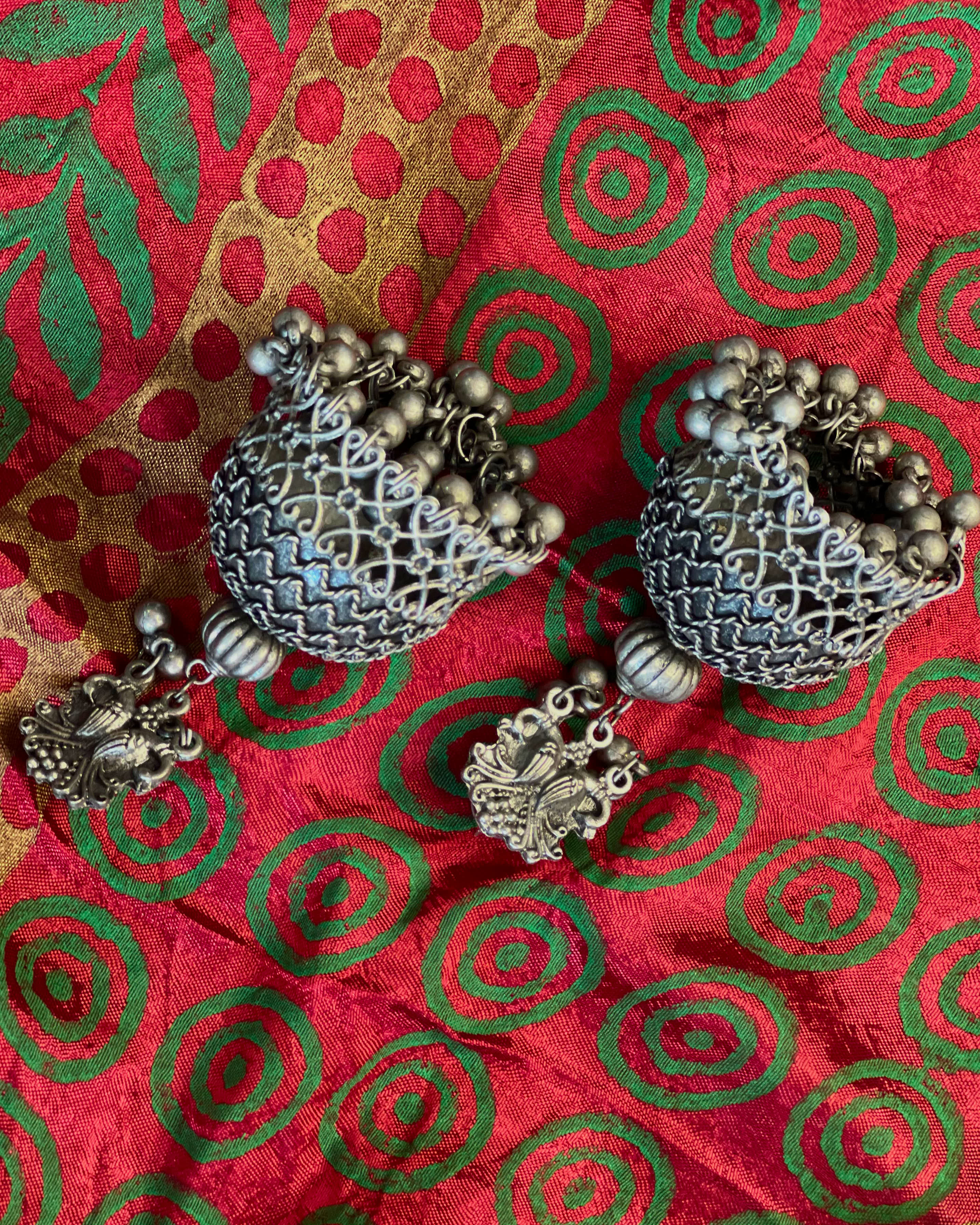 Statement silver-toned jhumkas with intricate lattice detailing and soft ghungroo accents.