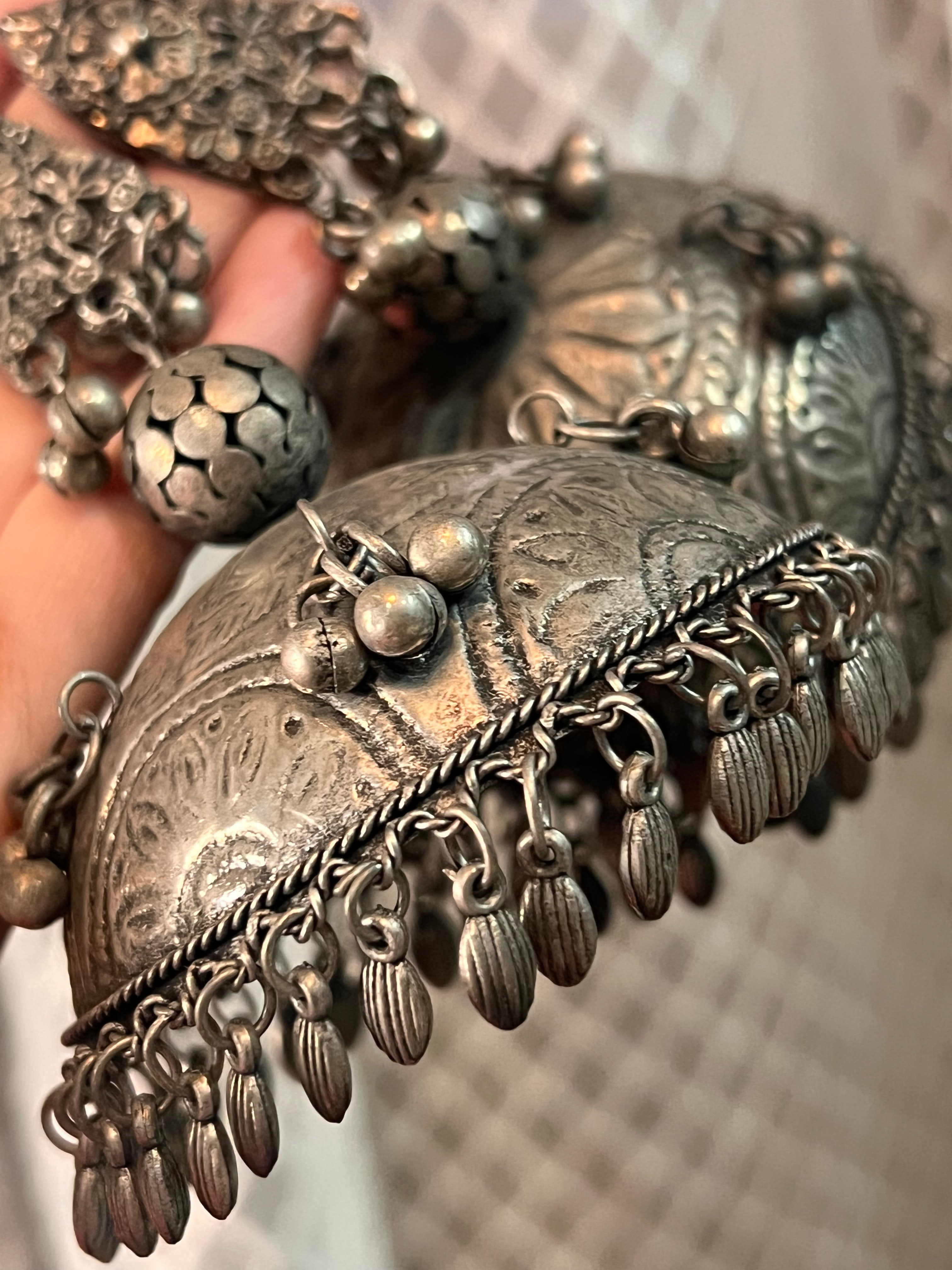 Statement silver-toned jhumkas with intricate detailing and layered ghungroo accents.