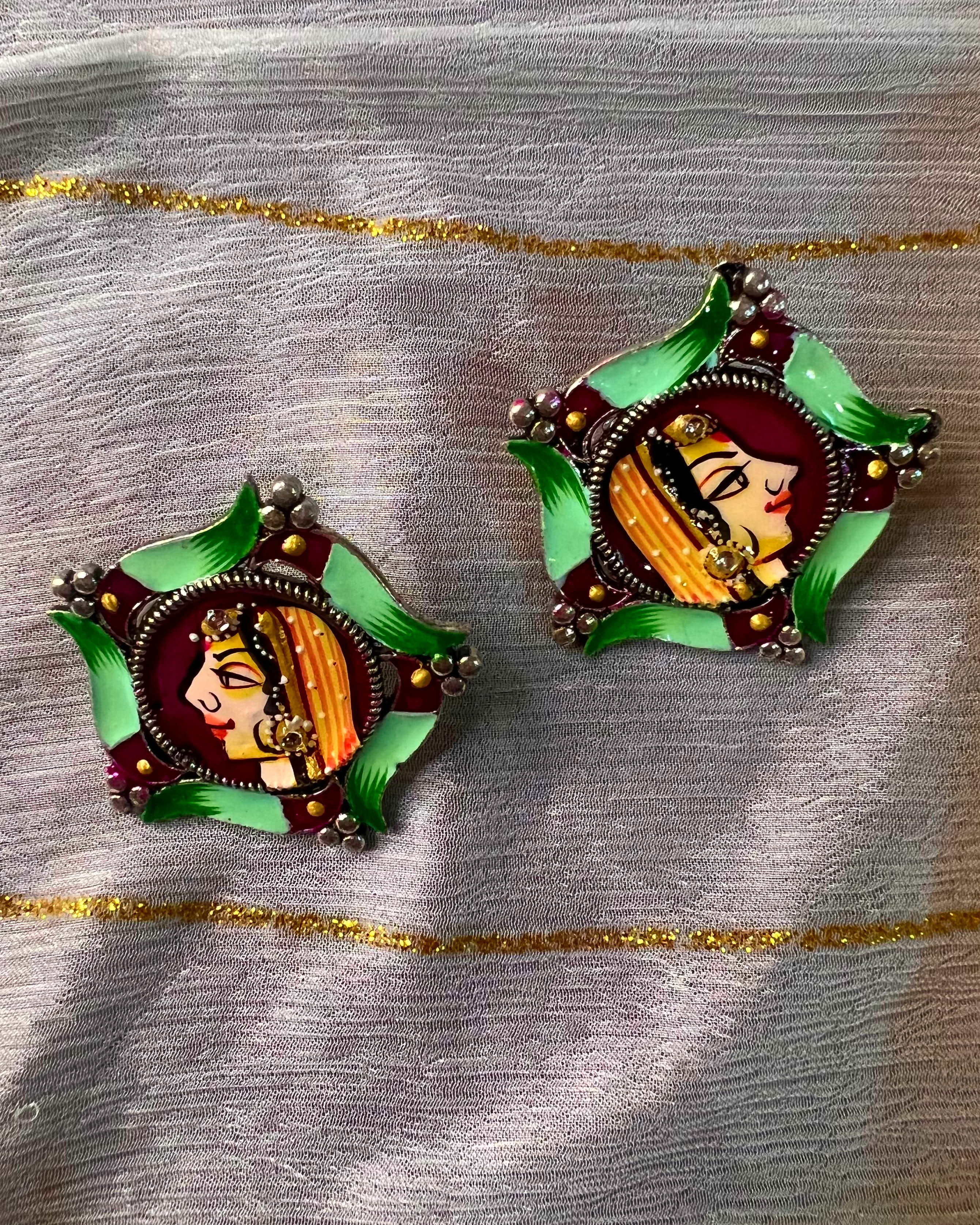 Hand-painted earrings featuring a traditional feminine portrait framed in vibrant, handcrafted detailing.