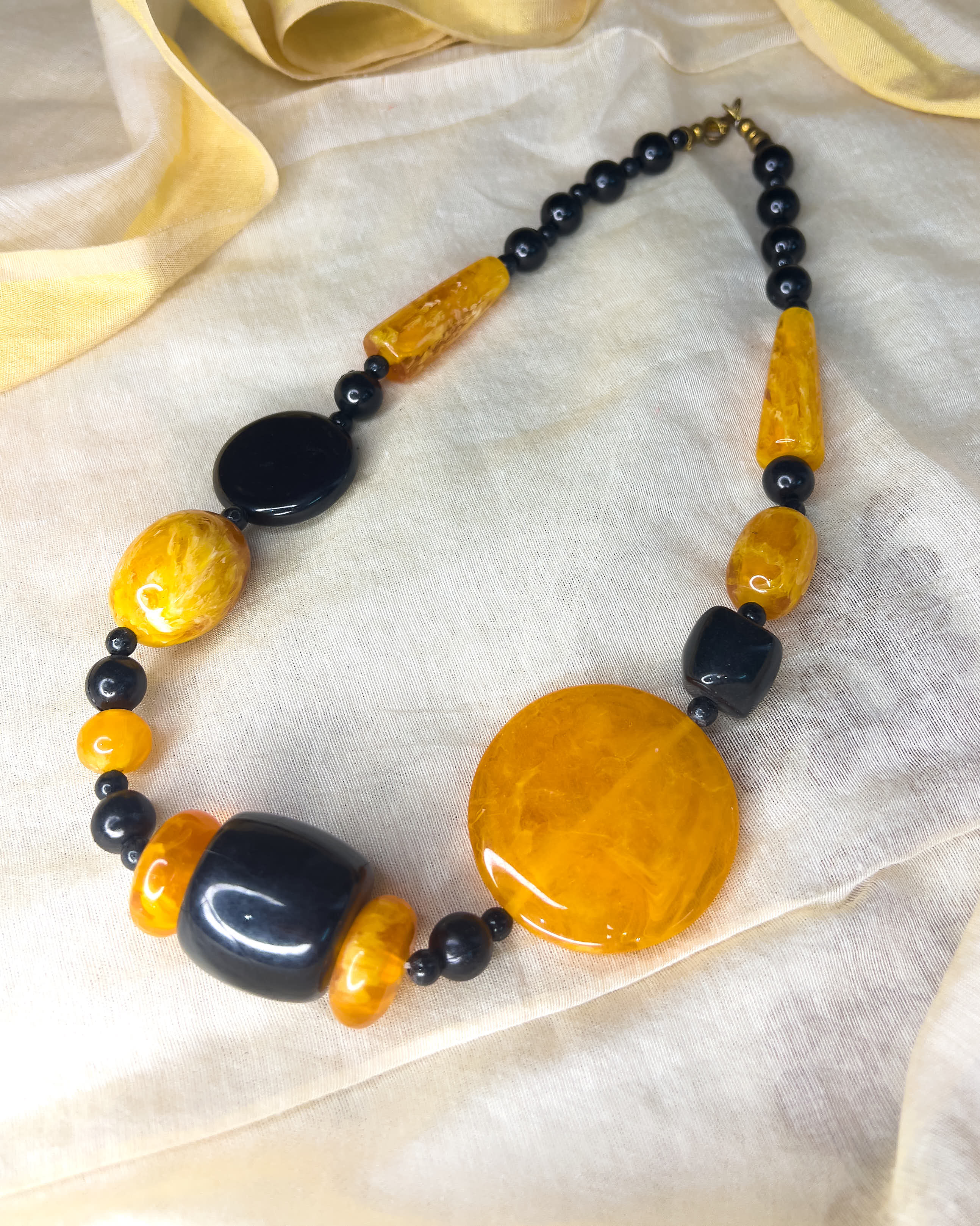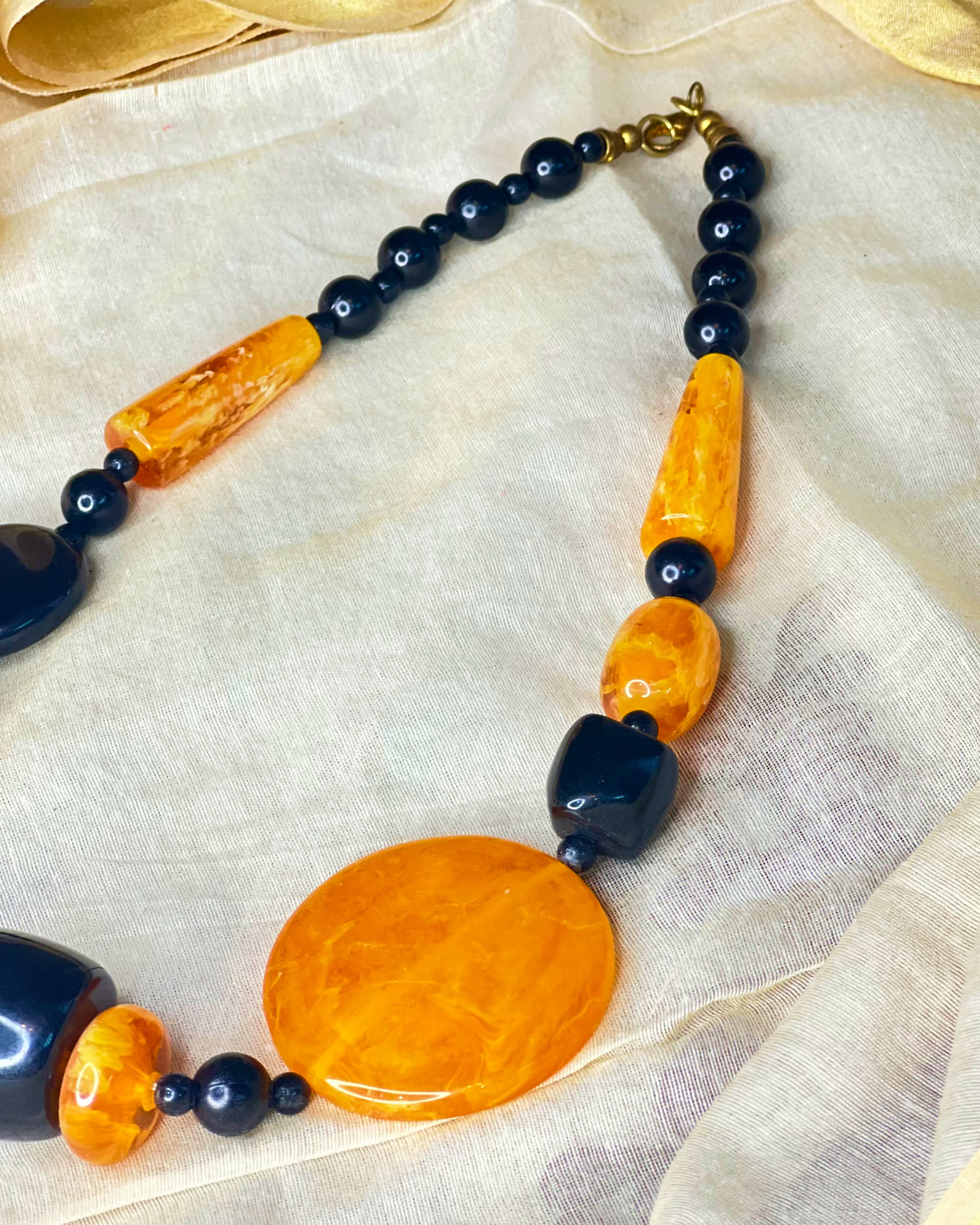 A handcrafted stone necklace combining warm amber hues with deep black accents in a balanced, statement design.