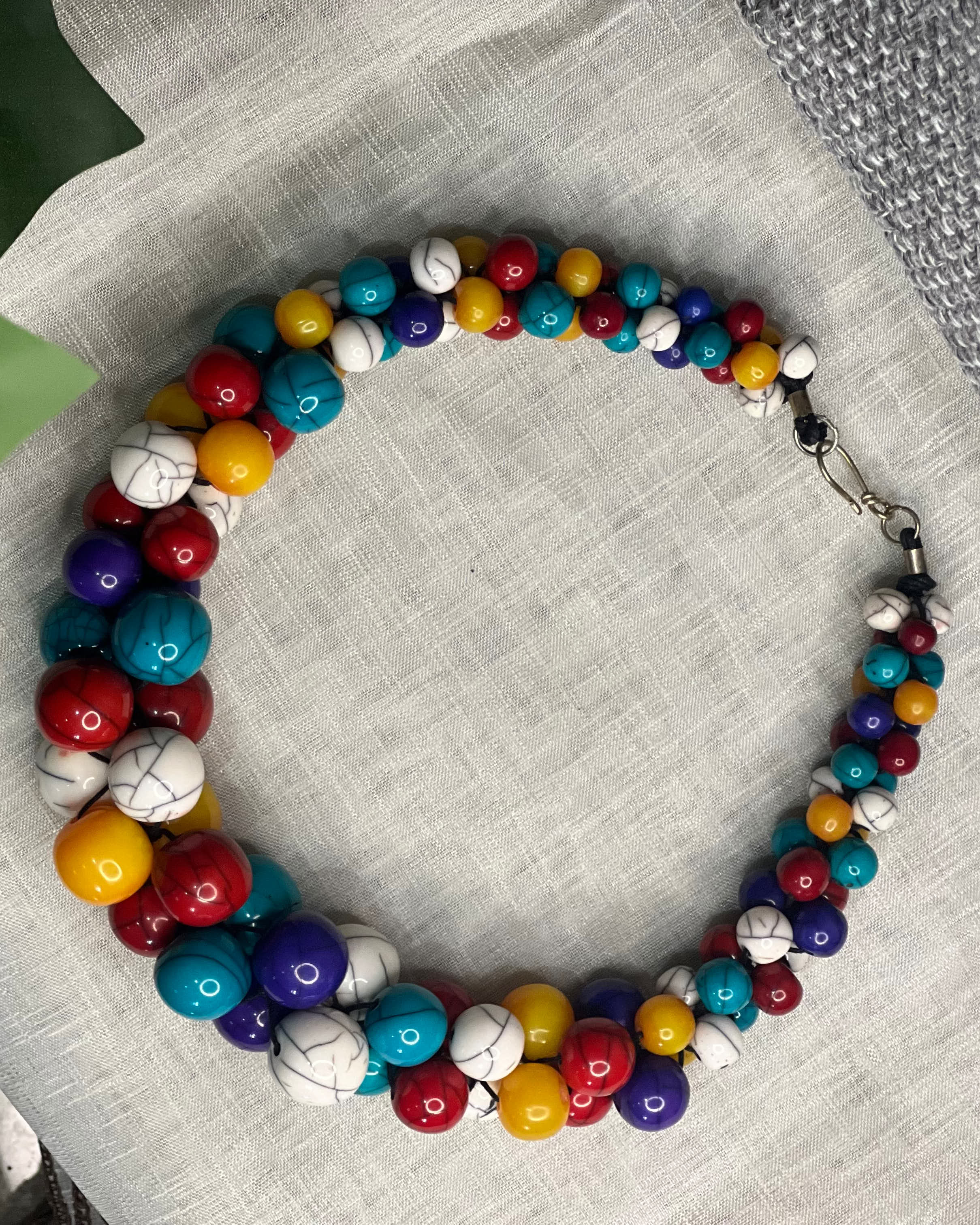 A handcrafted multicolour bead necklace featuring a joyful mix of vibrant tones in a bold, textured form.