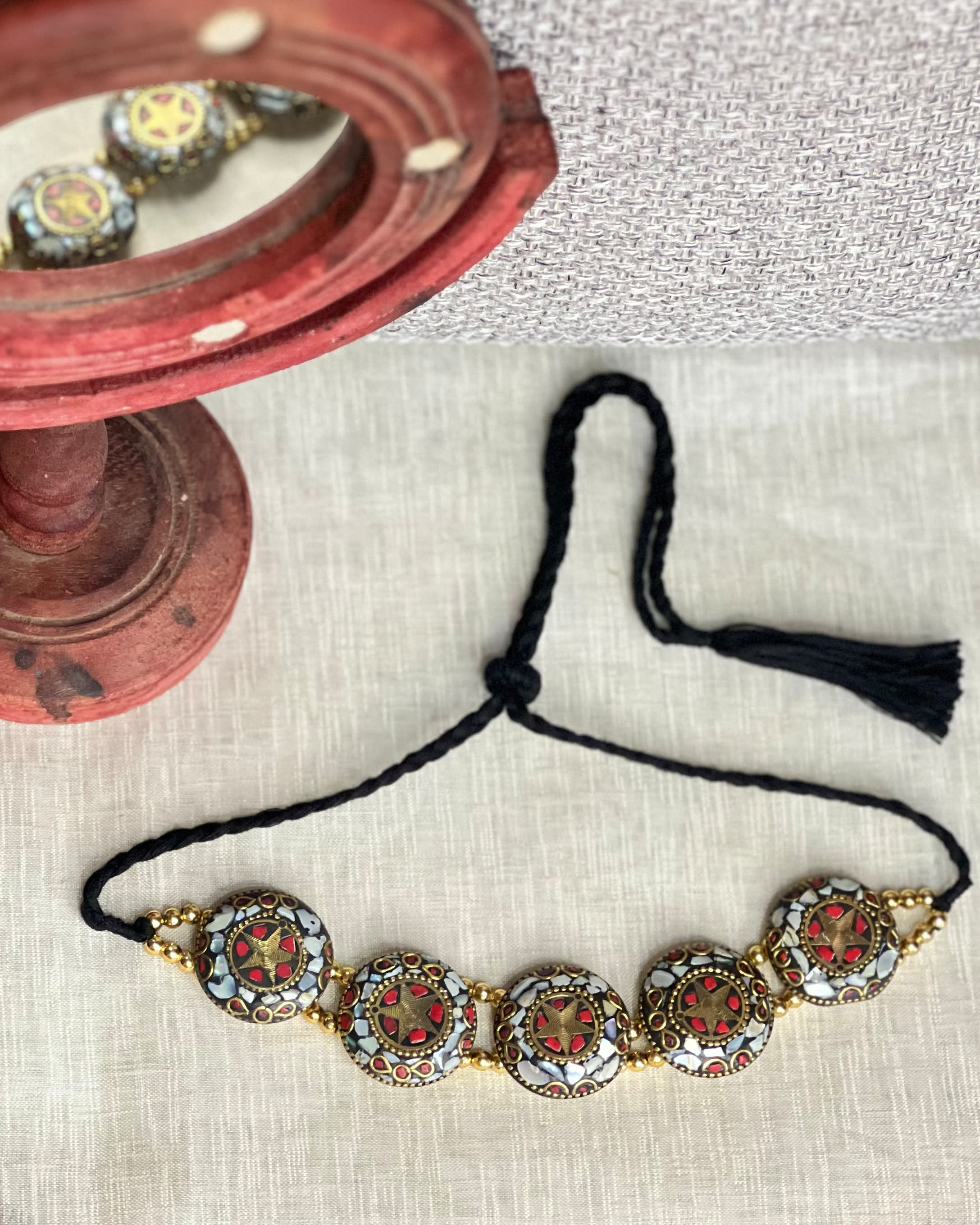 A handcrafted thread necklace featuring circular folk-inspired motifs with intricate detailing and a traditional tie-up finish.