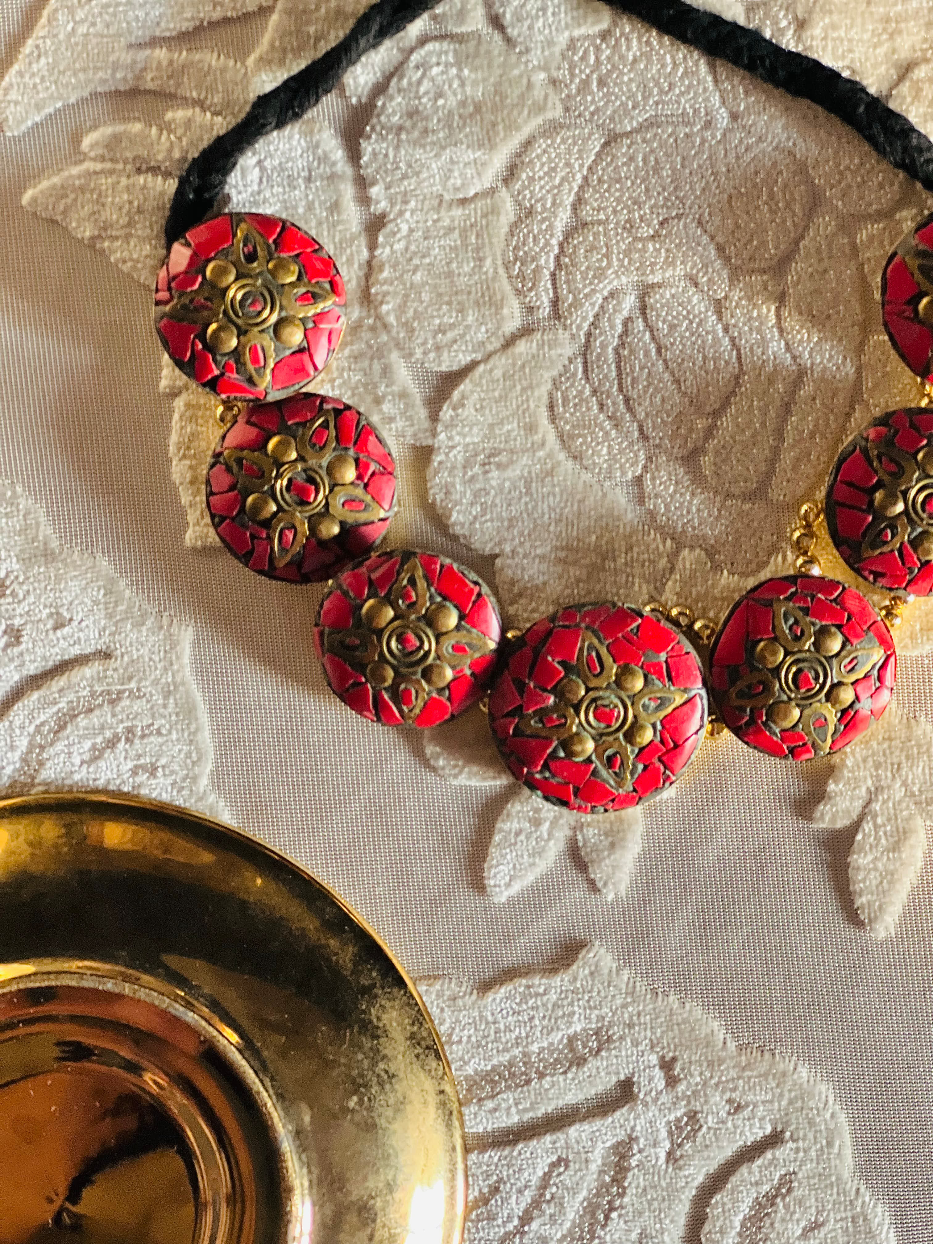 Handcrafted red-and-gold motif necklace on an adjustable black thread.