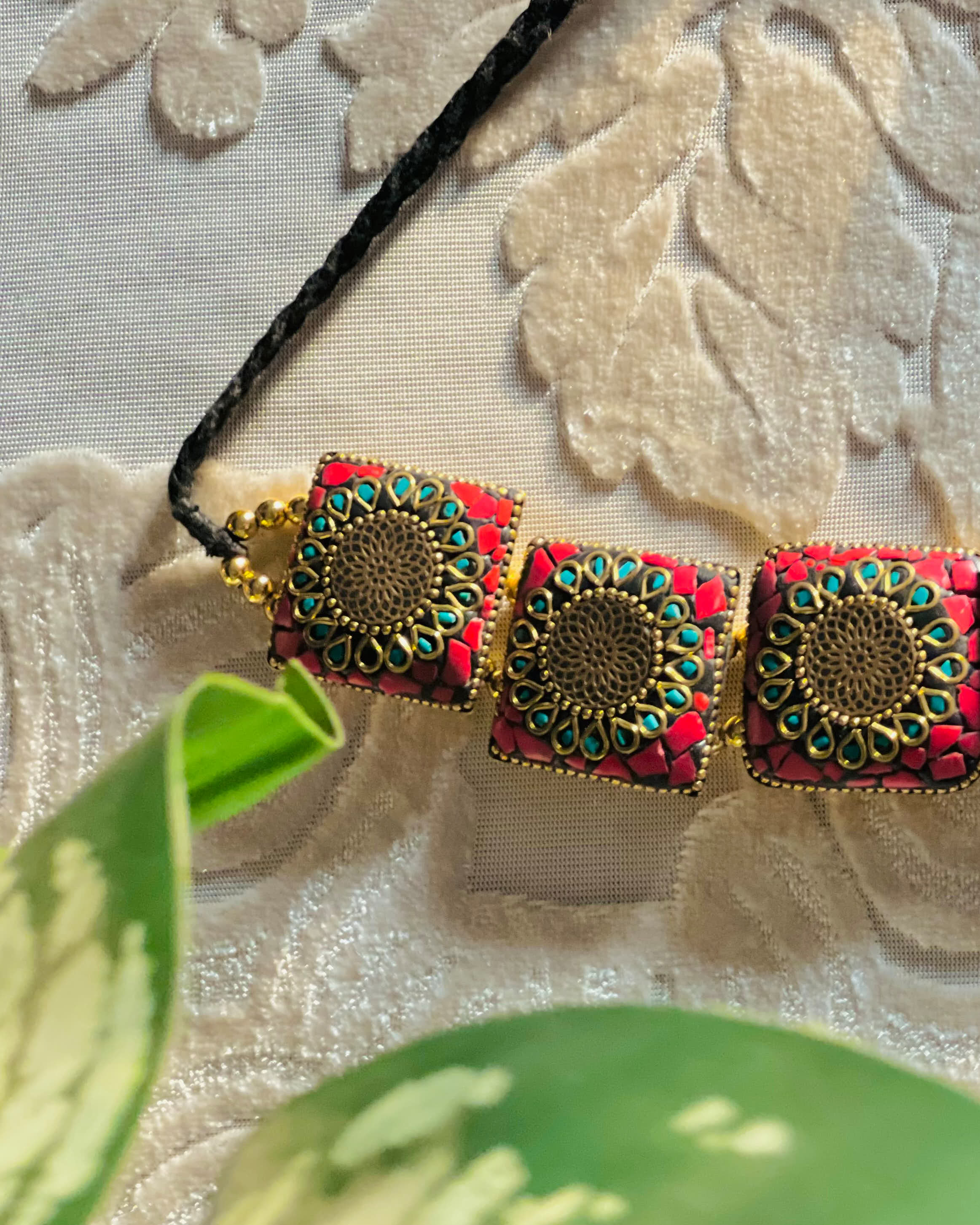 Red mosaic square-motif necklace with antique gold mandala detailing on an adjustable black thread.