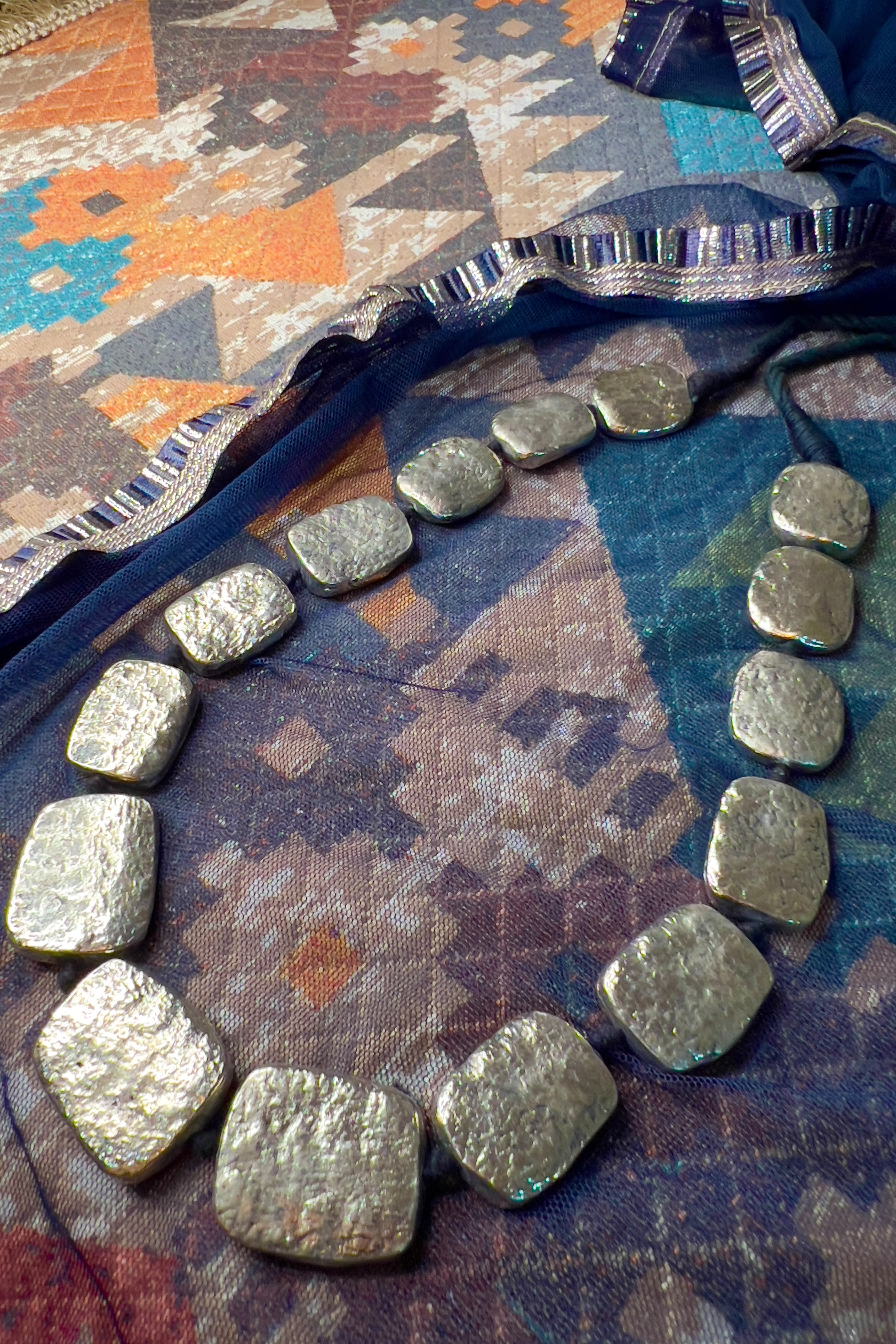 Hand-textured silver-tone stone necklace with an adjustable thread closure.