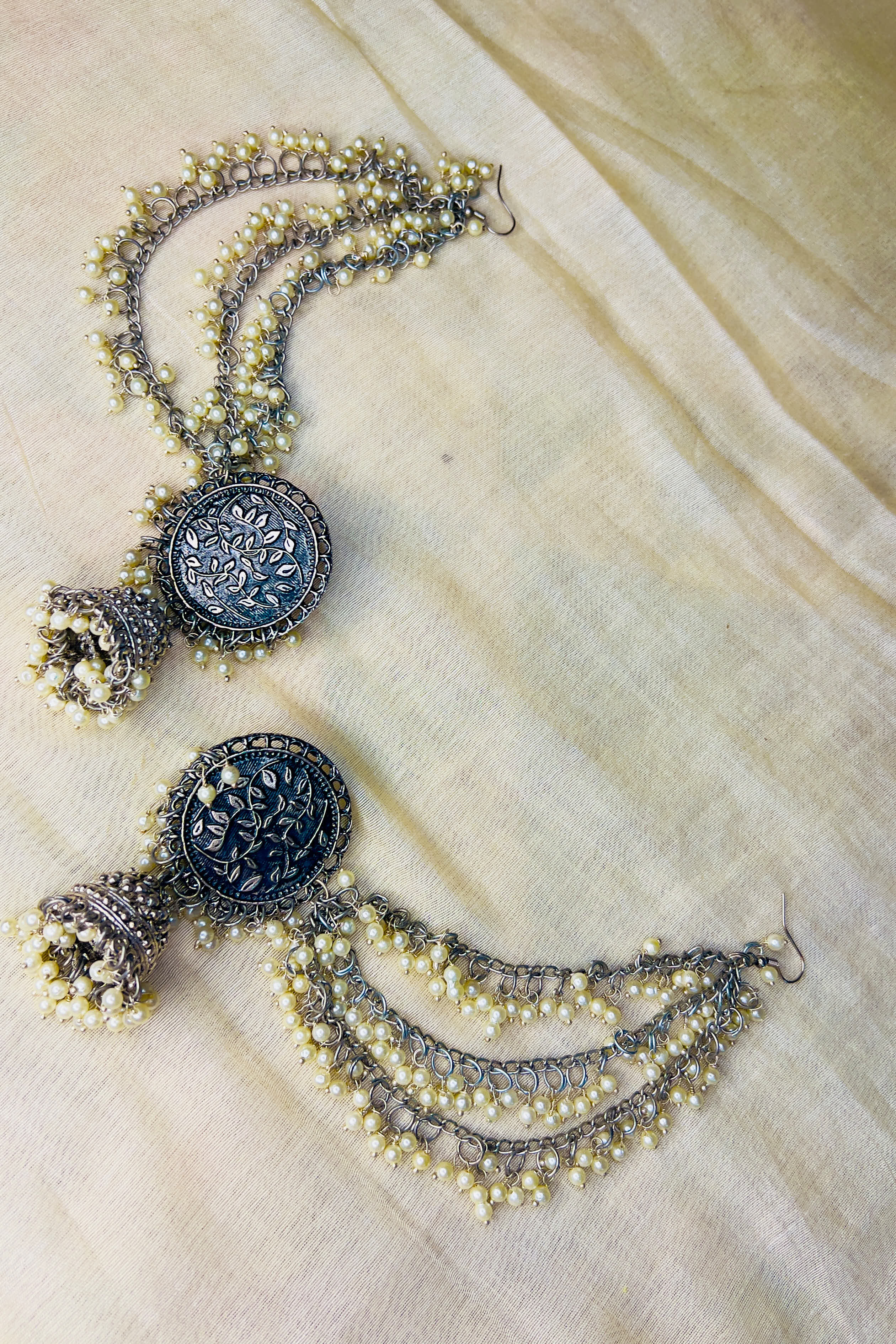 Silver-tone oxidised jhumki earrings with layered pearl chains and engraved medallion.