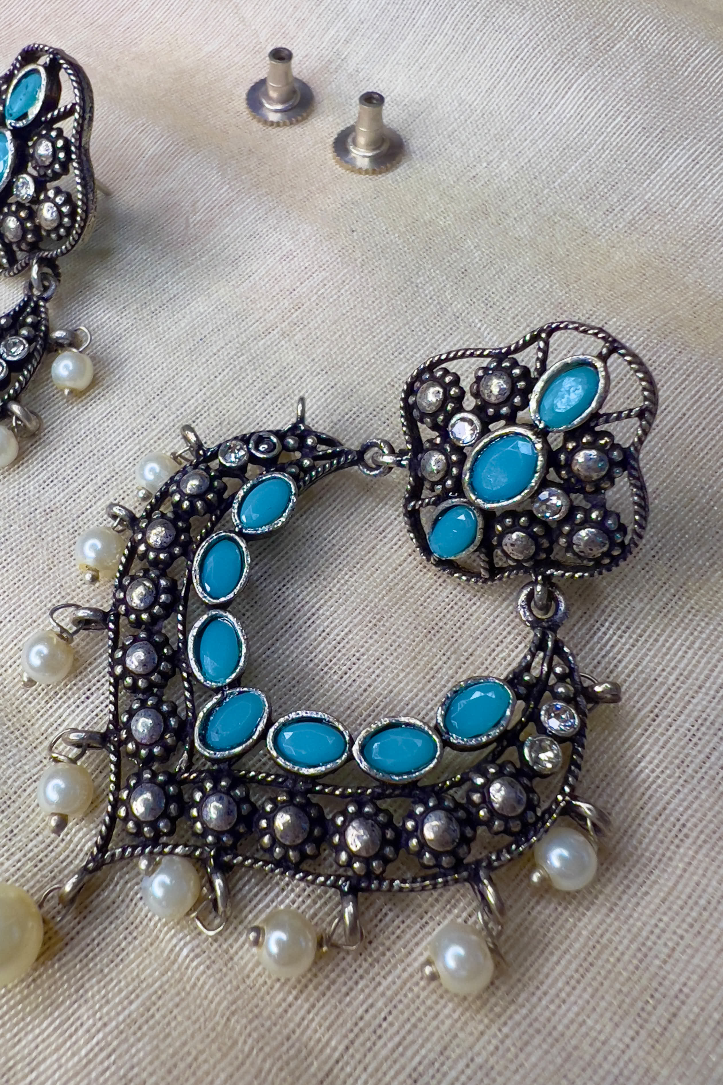 Silver-tone oxidised earrings with turquoise stones and pearl drops.