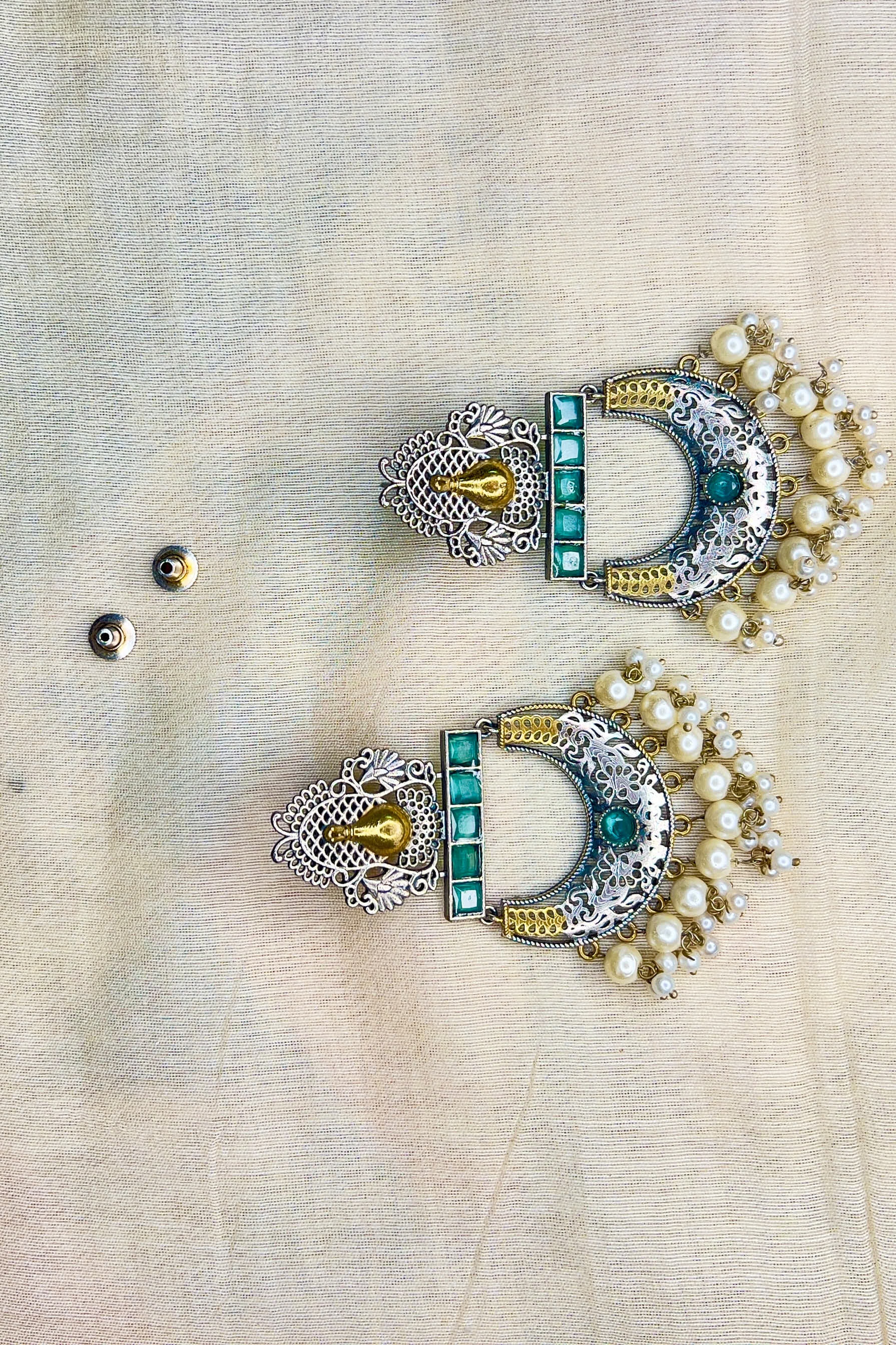 Oxidised silver-tone crescent earrings with green stones and pearl clusters.