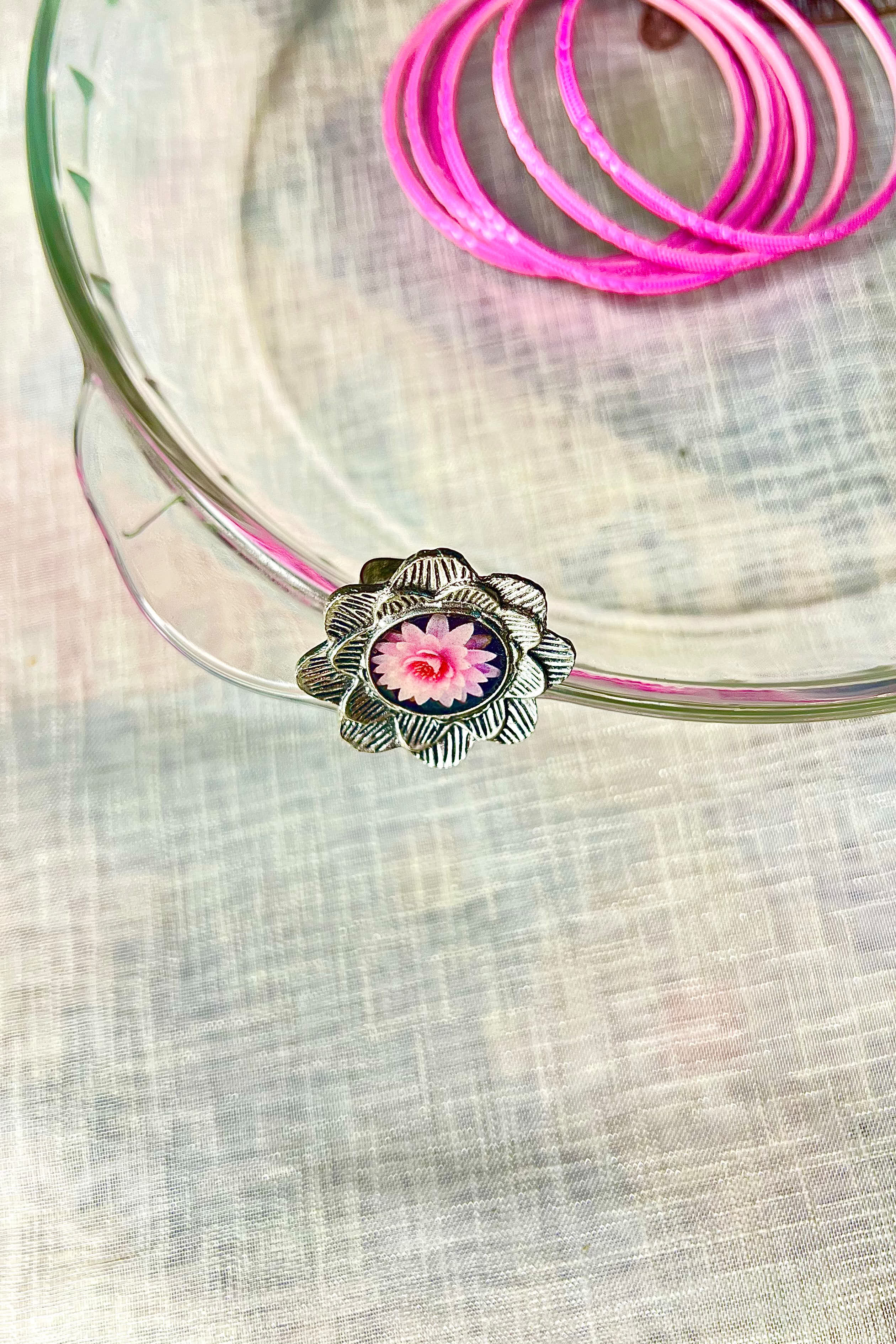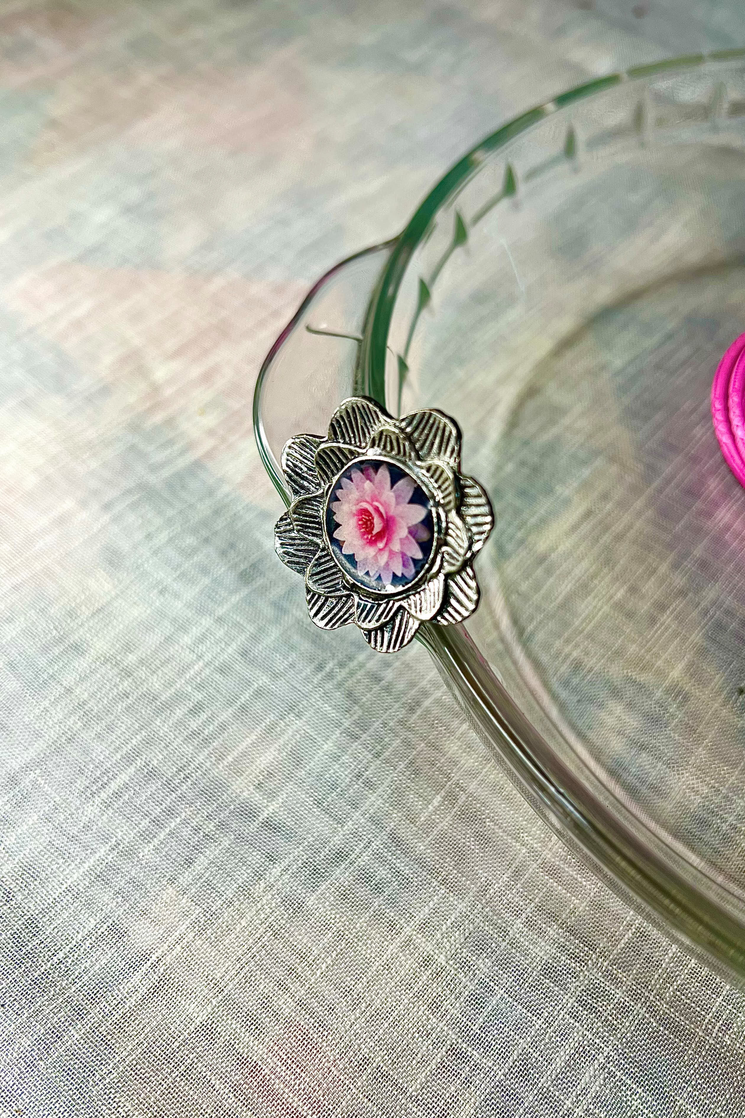 A silver-tone floral ring featuring a delicate pink bloom at its heart, subtle and soulful.